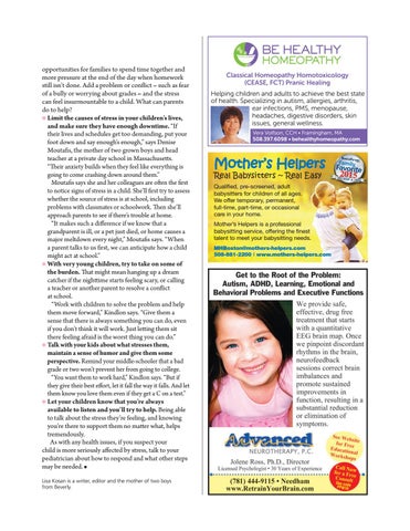 opportunities for families to spend time together and more pressure at the end of the day when homework still isn’t done. Add a problem or conflict – such as fear of a bully or worrying about grades – and the stress can feel insurmountable to a child. What can parents do to help? ✼ Limit the causes of stress in your children’s lives, and make sure they have enough downtime. “If their lives and schedules get too demanding, put your foot down and say enough’s enough,” says Denise Moutafis, the mother of two grown boys and head teacher at a private day school in Massachusetts. “Their anxiety builds when they feel like everything is going to come crashing down around them.” Moutafis says she and her colleagues are often the first to notice signs of stress in a child. She’ll first try to assess whether the source of stress is at school, including problems with classmates or schoolwork. Then she’ll approach parents to see if there’s trouble at home. “It makes such a difference if we know that a grandparent is ill, or a pet just died, or home causes a major meltdown every night,” Moutafis says. “When a parent talks to us first, we can anticipate how a child might act at school.” ✼ With very young children, try to take on some of the burden. That might mean hanging up a dream catcher if the nighttime starts feeling scary, or calling a teacher or another parent to resolve a conflict at school. “Work with children to solve the problem and help them move forward,” Kindlon says. “Give them a sense that there is always something you can do, even if you don’t think it will work. Just letting them sit there feeling afraid is the worst thing you can do.” ✼ Talk with your kids about what stresses them, maintain a sense of humor and give them some perspective. Remind your middle-schooler that a bad grade or two won’t prevent her from going to college. “You want them to work hard,” Kindlon says. “But if they give their best effort, let it fall the way it falls. And let them know you love them even if they get a C on a test.” ✼ Let your children know that you’re always available to listen and you’ll try to help. Being able to talk about the stress they’re feeling, and knowing you’re there to support them no matter what, helps tremendously. As with any health issues, if you suspect your child is more seriously affected by stress, talk to your pediatrician about how to respond and what other steps may be needed. ■ Lisa Kosan is a writer, editor and the mother of two boys from Beverly.