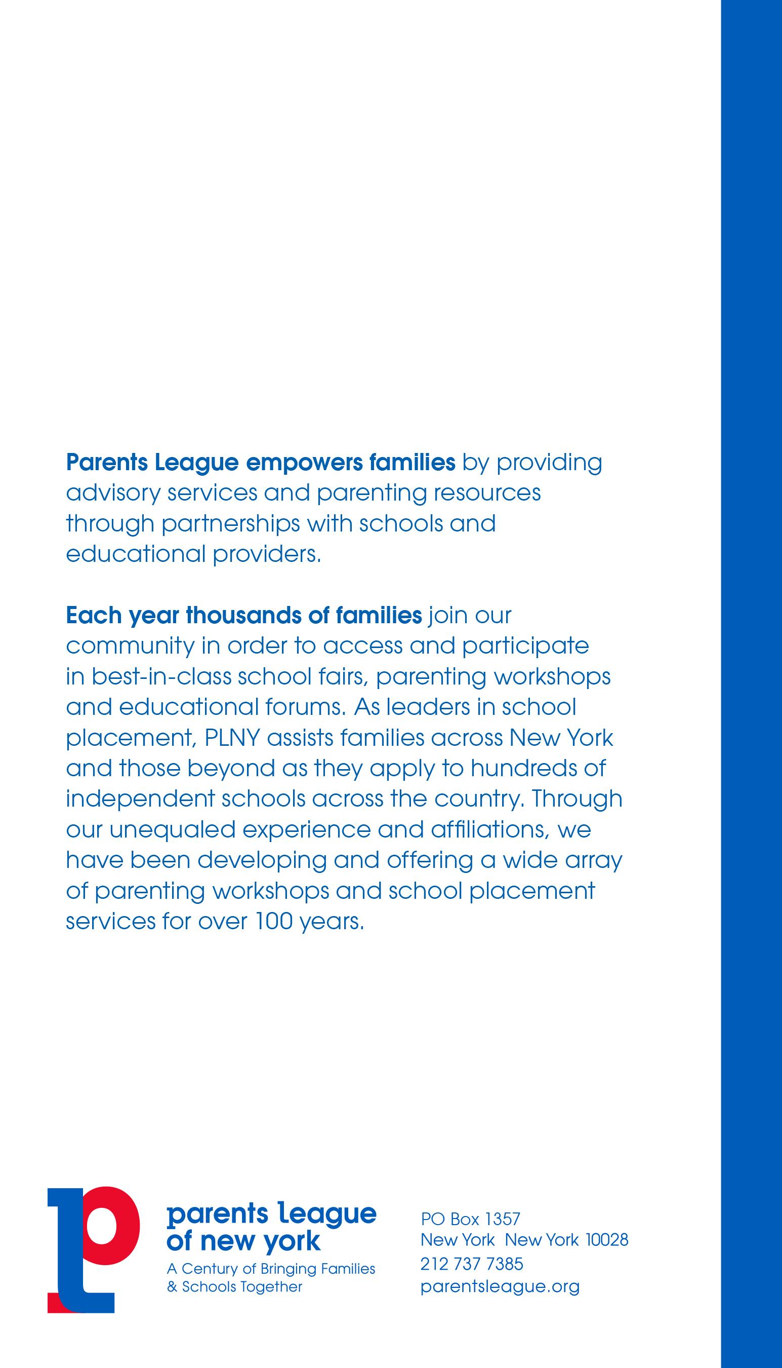 Parents League of New York was founded in 1913 as a coalition of independent schools and families in New York City. Today our connections reach both our ongoing members as well as the larger public, stretching from coast to coast and abroad. Deeply dedicated to our work, our mission is to empower families by providing advisory services and parenting resources through partnerships with schools and educational providers.