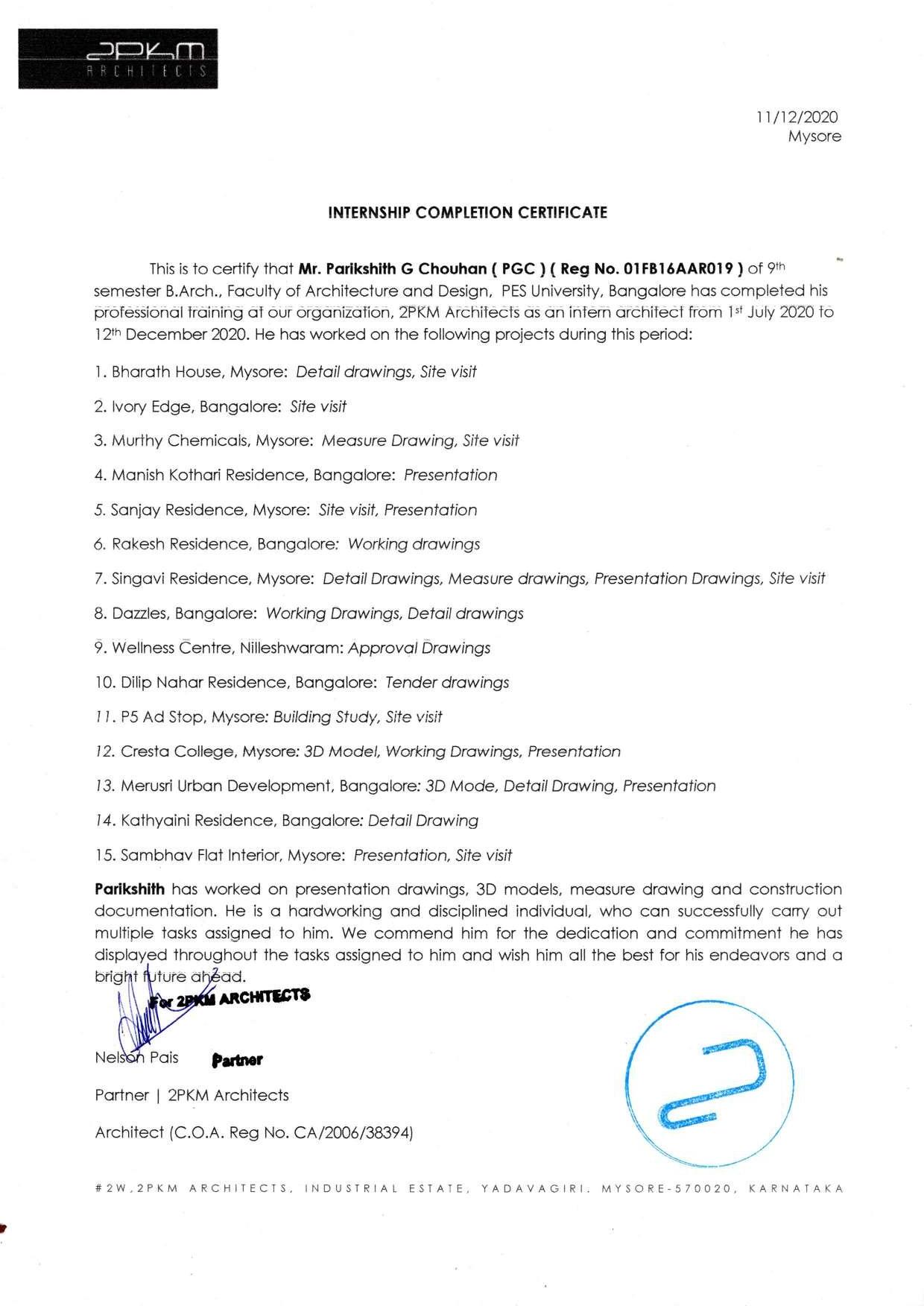 47 2 P K M A R C H I T E C T S 2/W, INDUSTRIAL ESTATE, YADAVAGIRI, MYSORE-570020 KARNATAKA, INDIA designmys @2pkm.com +91 8214193574 designmys@outlook.com PARIKSHITH G CHOUHAN 01FB16AAR019 INSTITUTION SIGN & SEAL FIRM SIGN & SEAL