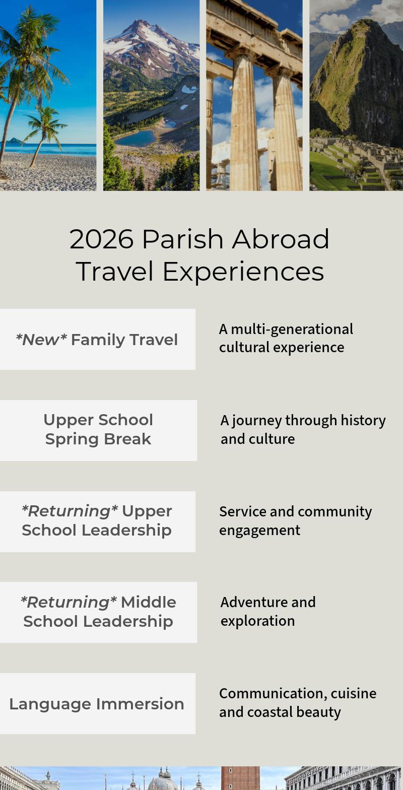 Parish Abroad is an educational program designed to enhance global competency in Parish students through intentional and impactful travel, equipping them with the skills for critical, ethical and global thinking.