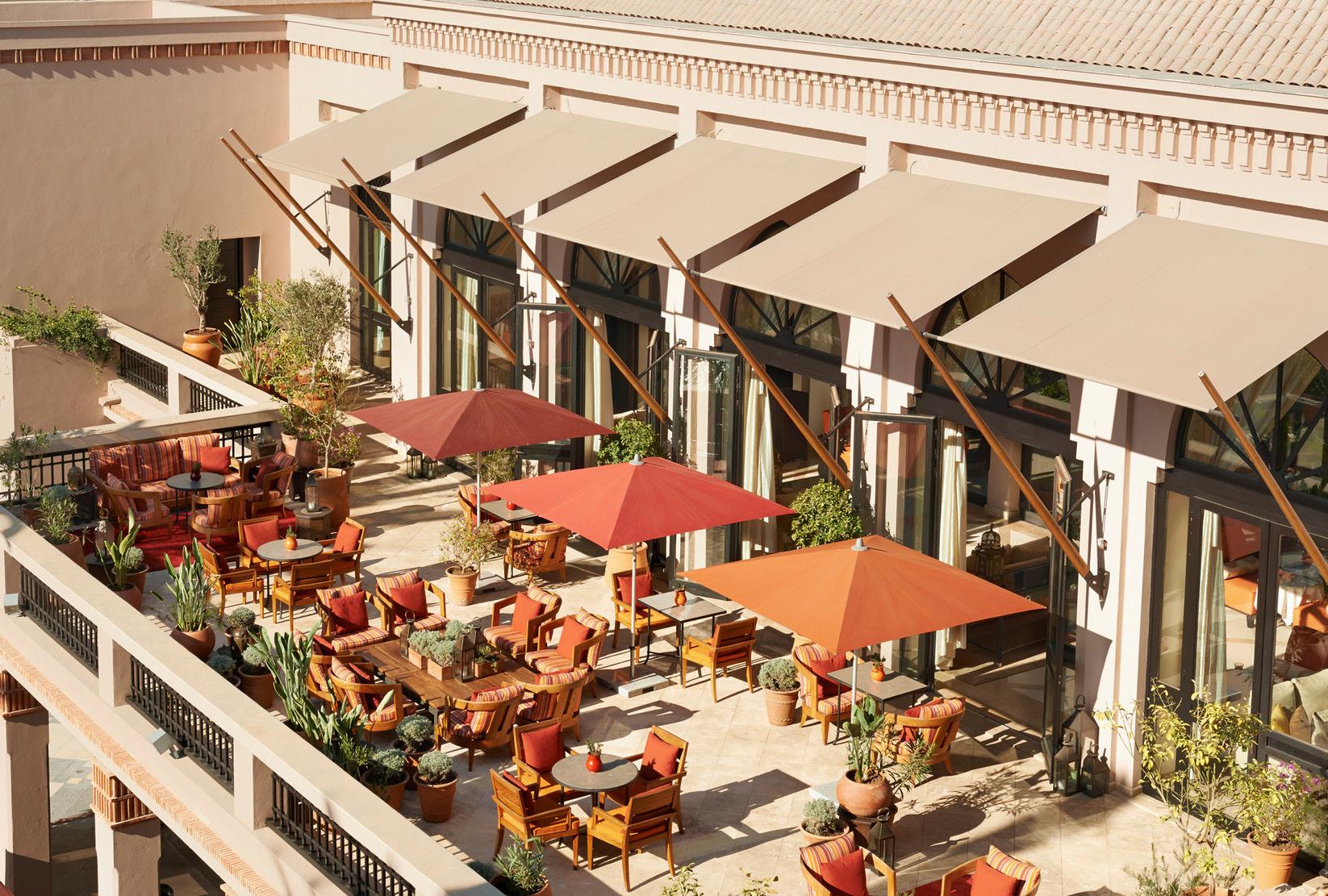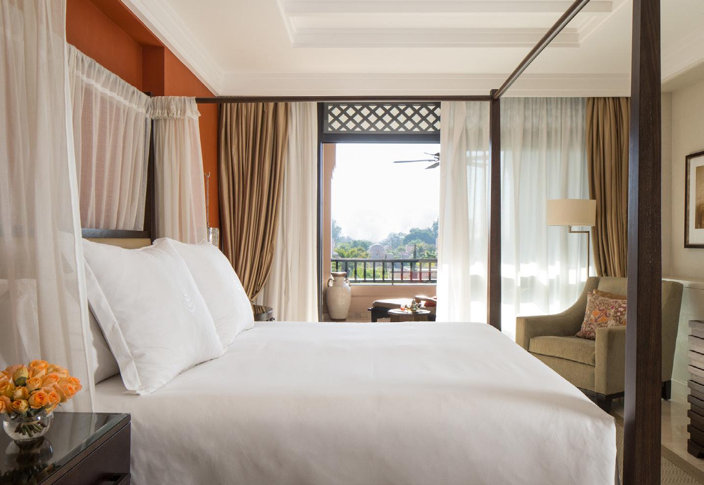The stylish and well-appointed guest rooms of this luxurious resort offer the very best in comfort and privacy. In the sun-splashed Garden-View Terrace rooms, a passionate shade of tangerine lights up the interior through the wallpapers and cushions, and then fades into a softer yellow on the petals of the roses delicately arranged within the silver vase on the nightstand. After a rejuvenating night of sleep, wake up to splendid views of the lush green canopy of the resort gardens before getting ready for an eventful day ahead in the ivory full marble bathroom furnished with handcrafted Moroccan décor details. If you crave even more sweeping settings, you could not go wrong with the Pool-View Terrace Room, where you will catch the sun setting over the pool’s shimmering waters while sipping on a cup of mint tea or nous nous (half and half Moroccan style) with friends and family on your private balcony.