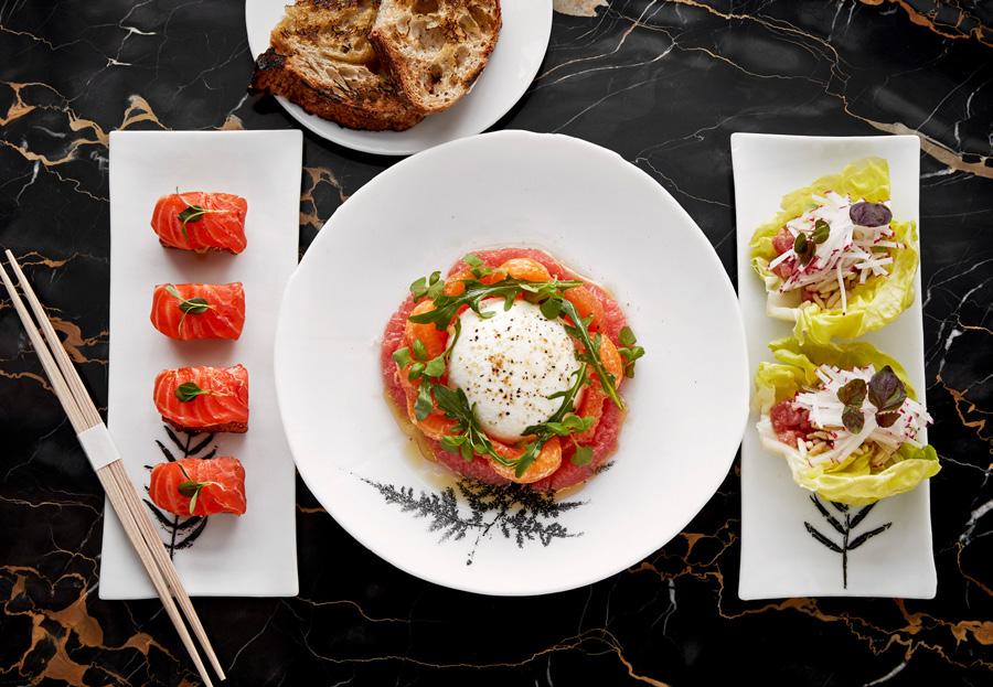 Step into Azzera, the pool side restaurant that offers something for everyone with its lunch and all-day menu; an assortment of avocados, romaine lettuce, tomatoes and prawns is mixed with red wine vinaigrette in the Cobb Gambas Salad. The Juicy Burger, as the name suggests, comes in a cerulean tray with dripping blue or cheddar cheese and a side of crispy golden fries. For the ones who appreciate a pleasant surprise, go for the Catch of The Day and explore new gastronomic depths in the daily fish selections and grilled vegetable skewers accentuated by taupe anais and ivy green parsley leaves.