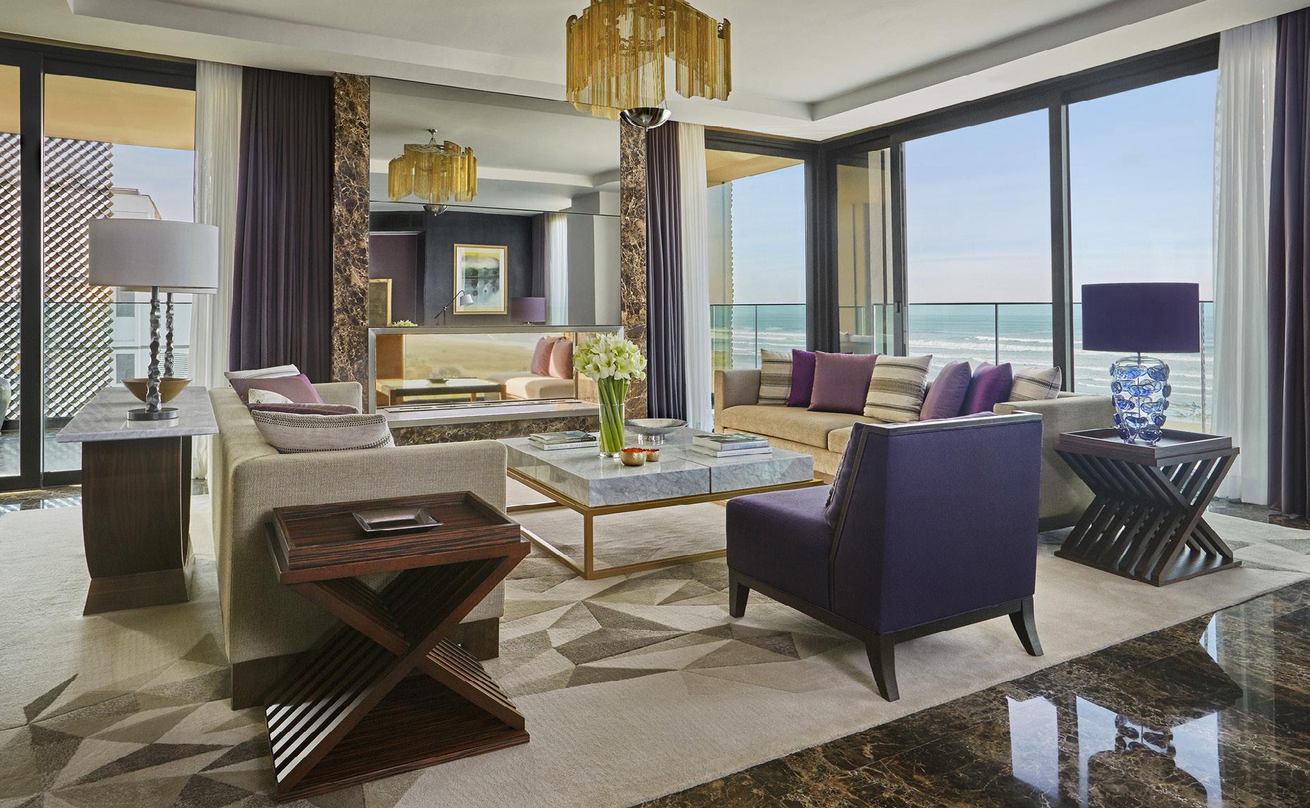 flooring and smart décor create a crisp ambiance. The peaceful bathroom, also lined with suave marble, may have floor-to-ceiling windows and a massive bathtub overlooking the beach and ocean. If the jaw-dropping view that overlooks the 100-year-old El Hank lighthouse is not entertaining enough, the bathroom does come equipped with a TV in the mirror for ultimate relaxation as you soak in your spa-grade bathtub. There is also a separate walk-in shower, leaving room for your travel companion to rinse as you bathe. The modern interior design of your room will also incorporate local Moroccan heritage by using traditional fabrics and brass finishings. These recommended rooms come equipped with private balconies, allowing you to enjoy an intimate breeze.