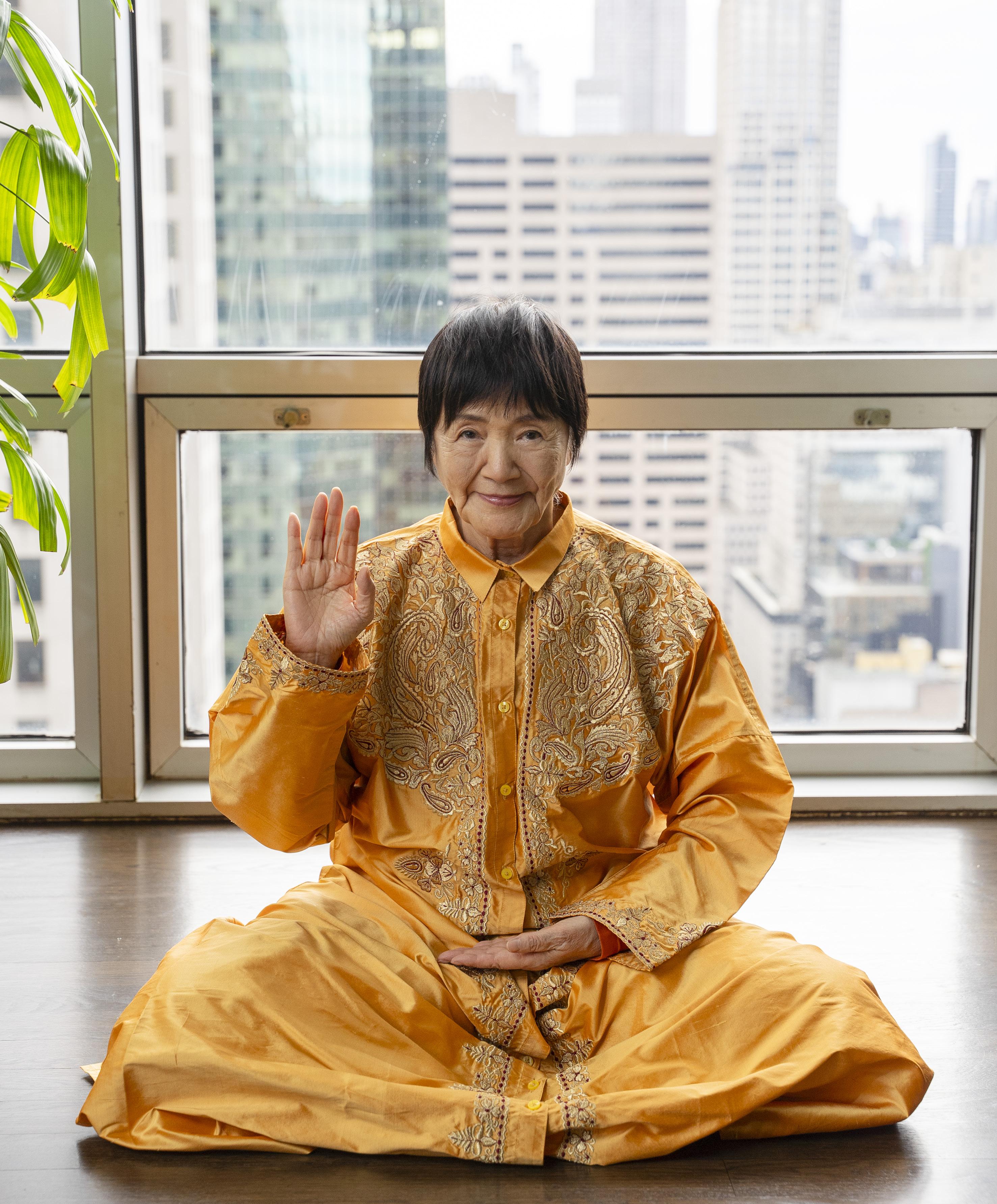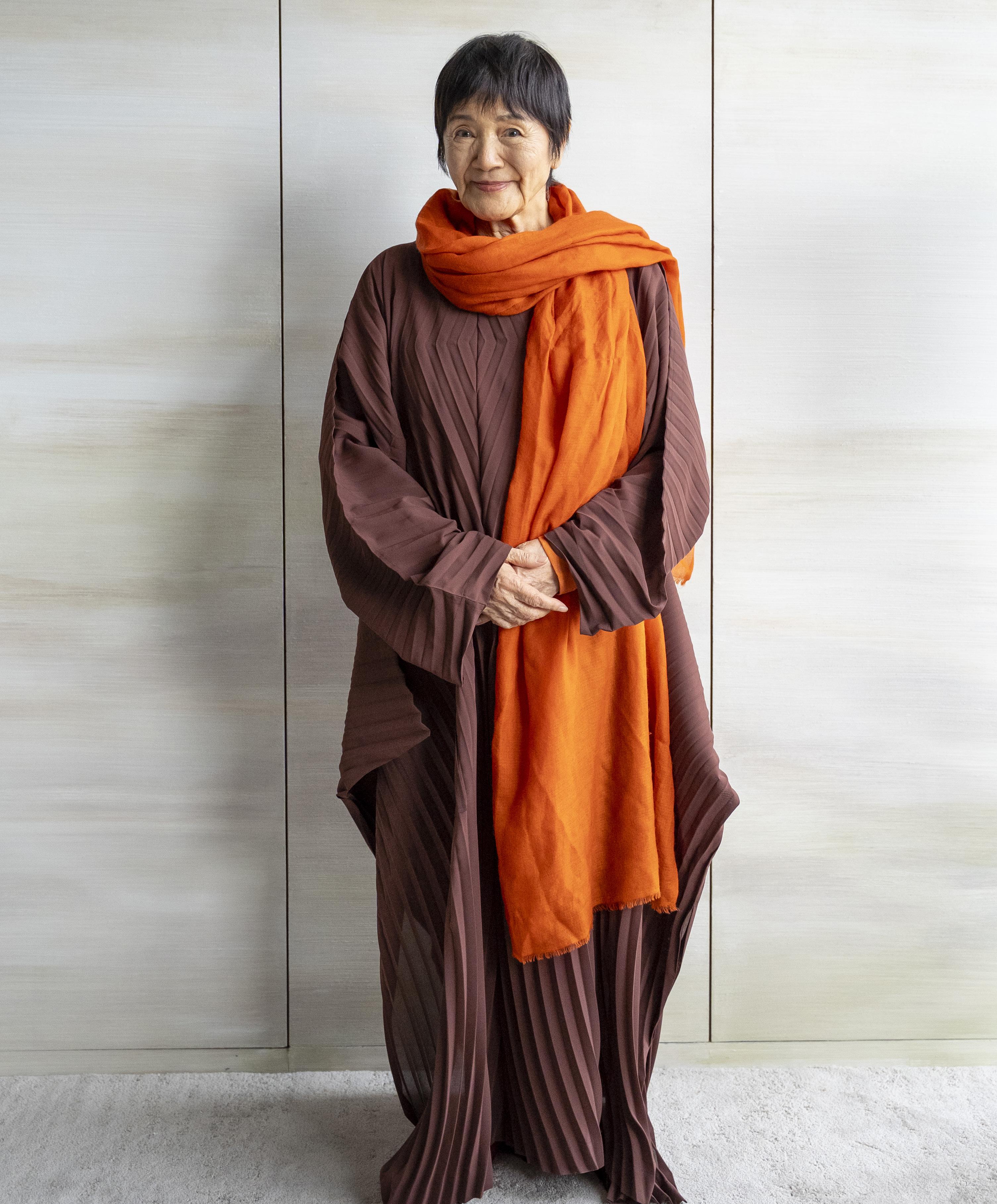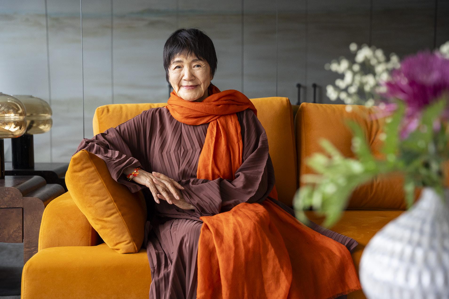 now red is very popular … I’ve always enjoyed red,” she says, before veering happily into her affection for blues, yellows, and greens. She avoids dusty tones–muted pinks, washed–out greens–that fight with her complexion. “Yellow is hard to pull off,” I suggest. “You can pull it off; very few people can.”