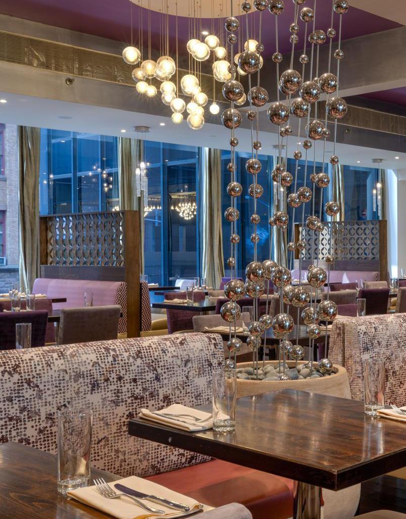 The space itself is designed to hold multitudes. “It’s two levels,” Khanna says. “There’s a bar on the first floor, outdoor dining available in summer, and then upstairs you have a large dining room that seats close to 200.” There’s also a private room for roughly 25, and the main room can be partitioned “with a soundproof partition” to create a smaller salon for about 70 to 80 guests. Full buyouts happen, too – 150 seated or 200 standing – making that bridgein-the-sky double as an events hall with a Midtown panorama.
