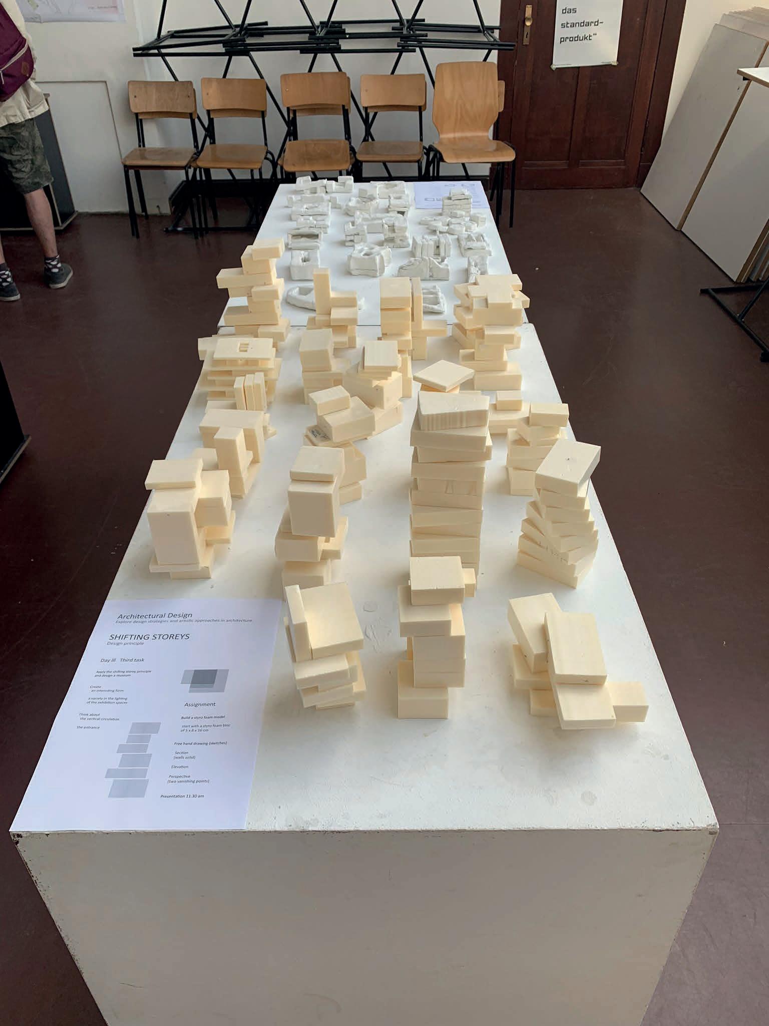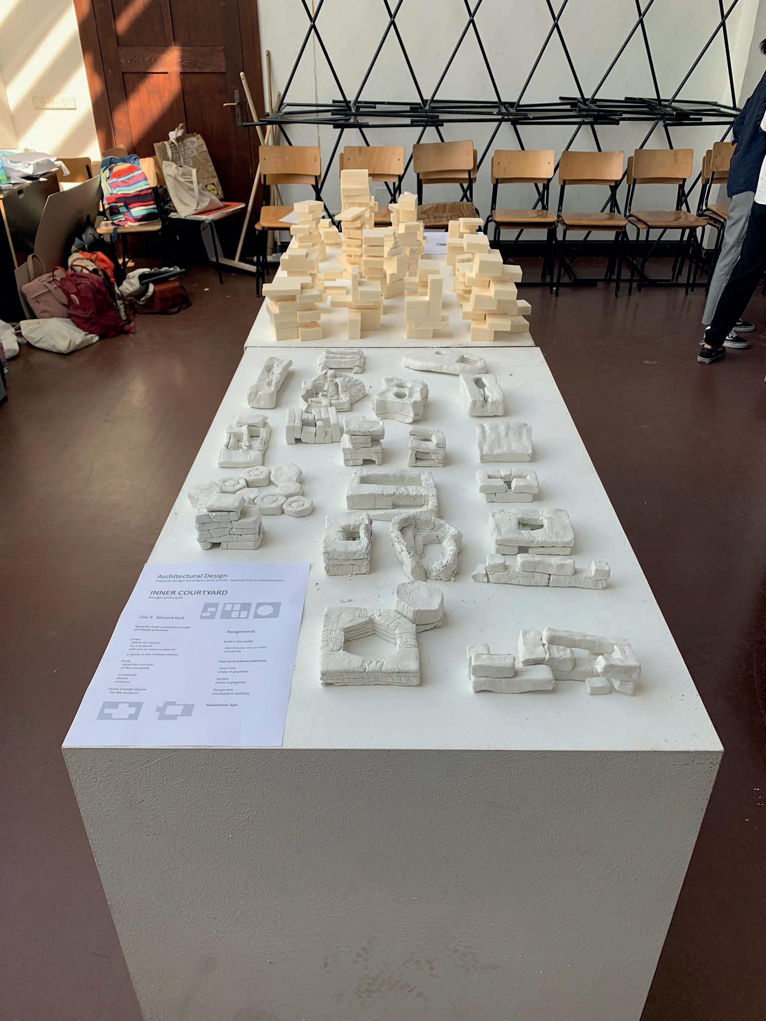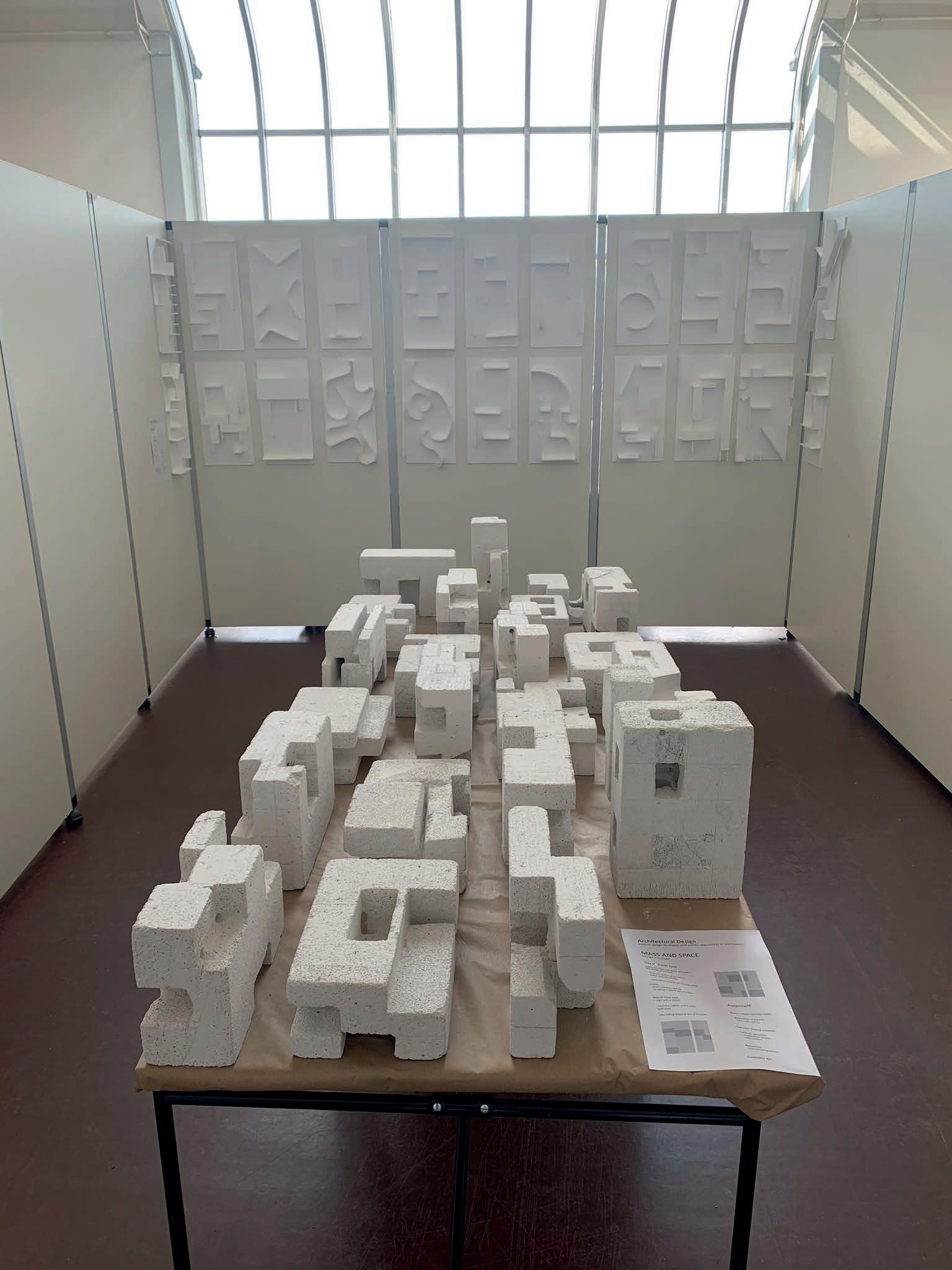 In the Architectural Design course we explored some of the design strategies applicable to architecture. Some of these include the study of the open plan, inner courtyards, mass and space, shifting volumes, and so on. The learning process included a theory class and a practical class in which we sculpted and modeled architectural shapes that corresponded to the task.