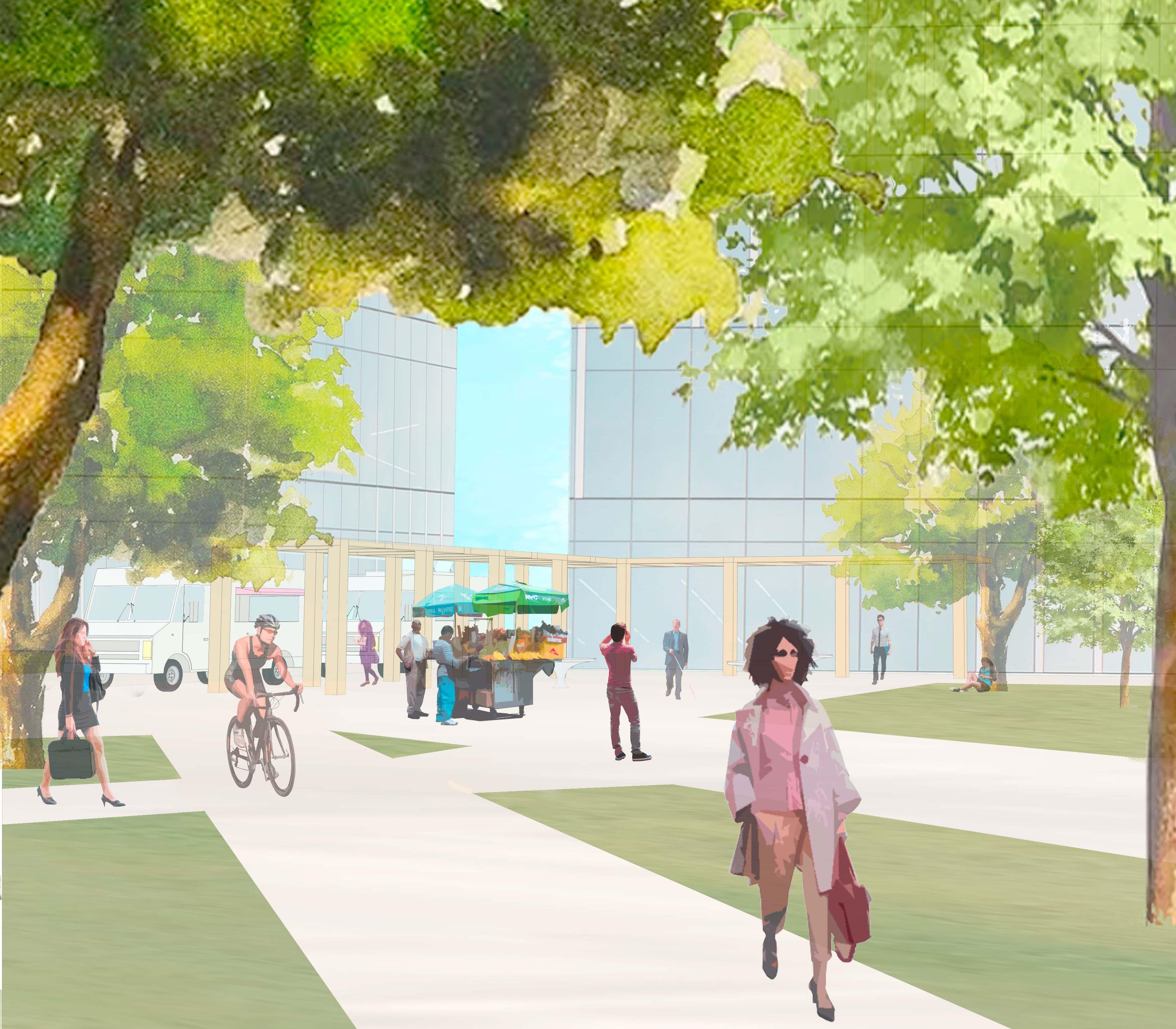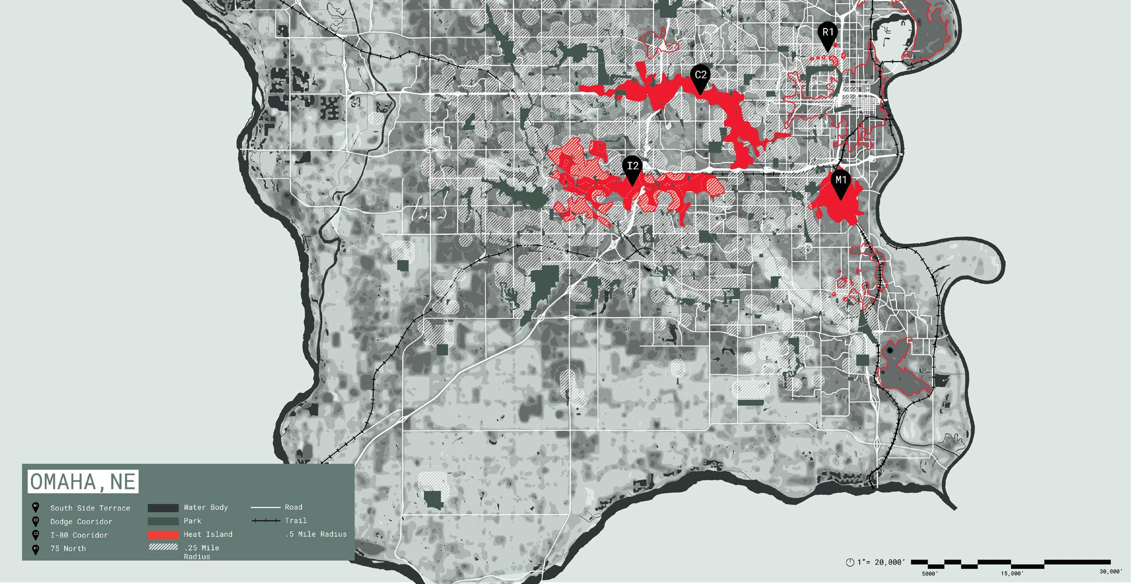 The idea of this is to reduce heat pro duced by the industrial prominent area of central Omaha. To accomplish this, the project will focus on three main groups, urban Structure, and Street Scape, and Infill. Combining x-urban and city beau tiful movement tactics along with more Eco-friendly water management solutions the goal is to make highly industrialized zones more pleasant for its users. My first goal was to create new water man agement utilizing storm water through bioswales, catch basins and ponds. Sec ond was to identify the low use storage lots to infill with natural grass plantings and pollinator gardens. My last goal was to increase overall green buffers around sidewalks and roads using street trees to provide shade in the warmer months and to still allow sunlight during the cold winter months. These goals with help to lower the average temperature and make this a more comfortable and safer place to walk.