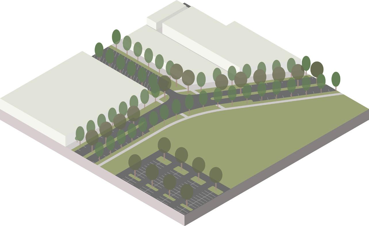 Improve water quality, enhance workability and bikea-bility, and create an inviting environment with bioswales, green buffers, and shade trees.