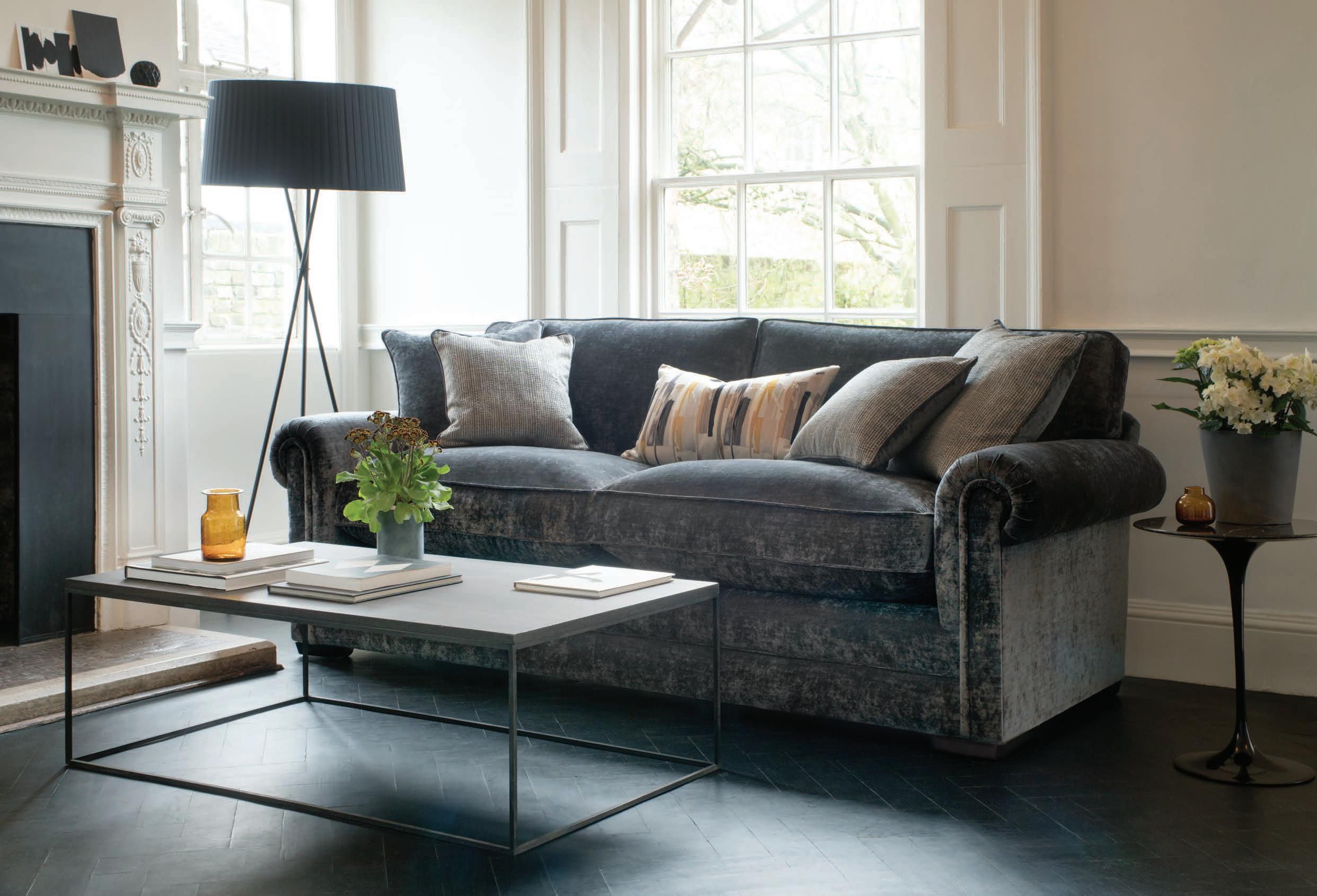 Cover: Canterbury Two Seater Sofa in Oxford Midnight, scatter Stylist’s own This page: Devonshire Chaise Unit in Gala Plain Dove Grey, scatters in Maroc Sage