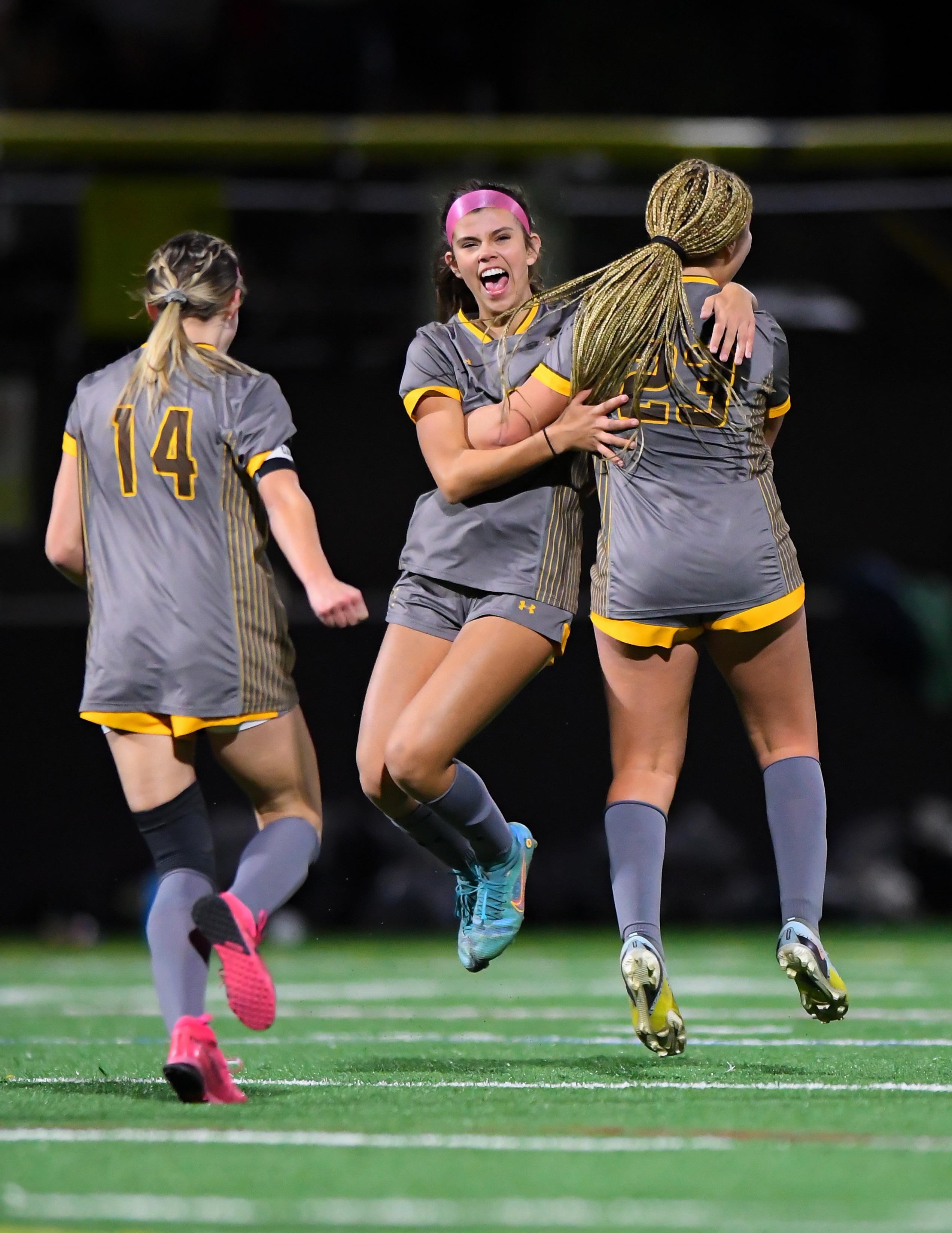 Girls varsity soccer team celebrates a win during their standout season.