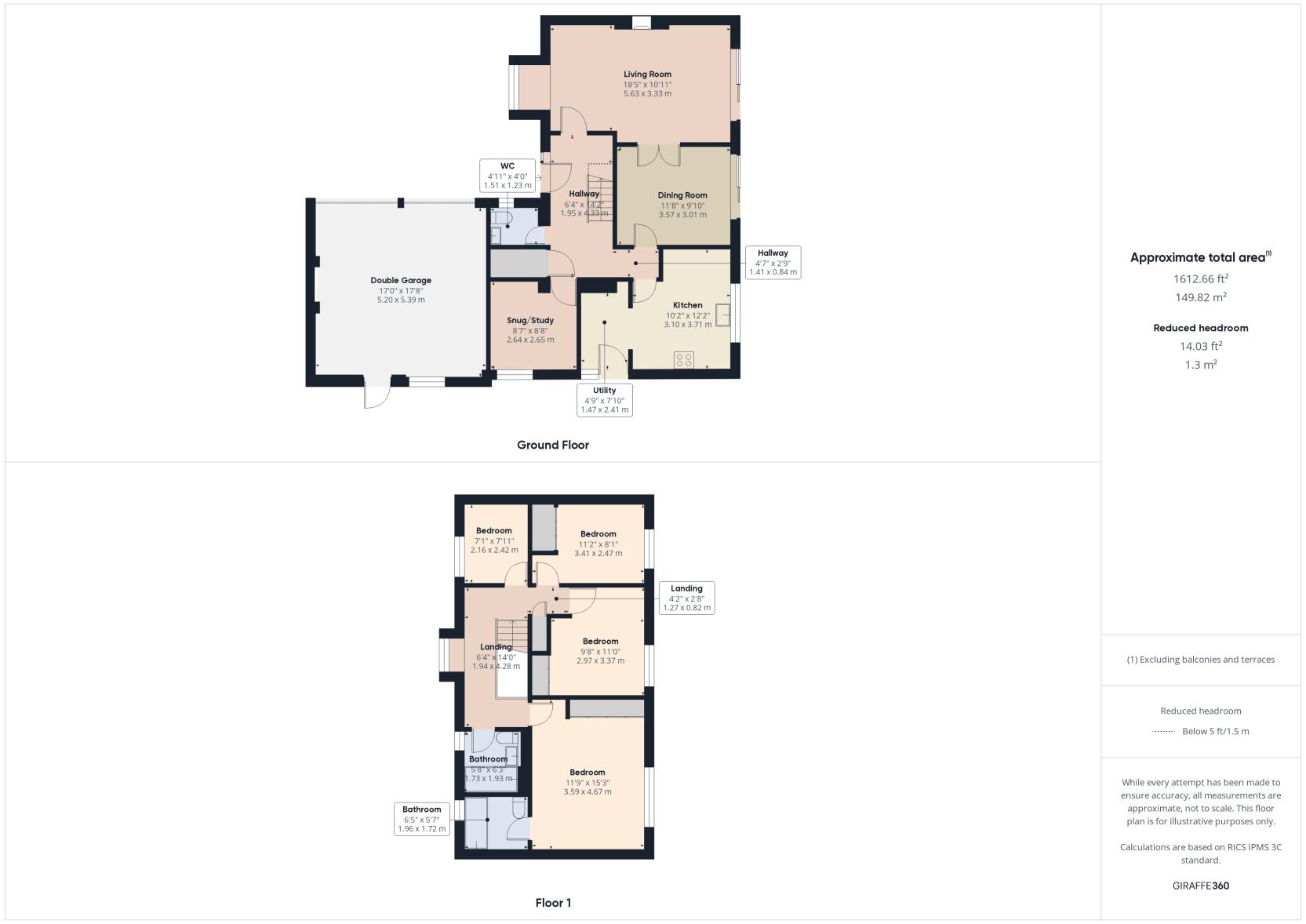 The entrance hall offers a practical under-stair study space and a convenient coat cupboard. The bright and spacious living room features a bay window, patio doors leading to the sunny rear garden, and double doors opening into the dining room. The modern fitted kitchen is equipped with a range of Smeg appliances, a wine fridge, and sleek quartz worktops. Additional ground floor amenities include a utility area, a versatile study/snug, and a cloakroom.
