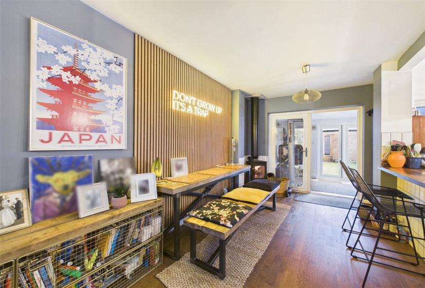 The heart of the home is a stylish open-plan kitchen/diner featuring a breakfast bar and wood-burning stove, complemented by a spacious living room and an additional reception room, ideal for a home office, playroom, or snug. Upstairs are three well-proportioned bedrooms and a modern bathroom suite.
