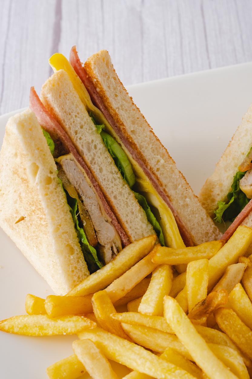 sliced bread with, egg, ham, & veggies in between served with fries on the side