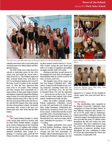 valuable newcomers who scored at the girls sectional meet were Jillian Miller and Margherita Firenze. The Park Tudor boys team faced five schools in individual meets for the 2016 school year and ended the season with a team record of 3-2. The Panthers improved their sectional finish from 11th place in 2015 to an 8th place finish in 2016. In 2013 the team scored 44 points at the sectional meet. In 2016 the boys improved their team score to 136 points. Peter LaBarge and Alex Gregory were responsible for a large portion of team point improvements, and superior teamwork helped the Panthers improve their 2016 relay placing in the 200 medley and free relays (5th & 4th). In 2016 the boys also placed 9th in the 400 free relay and had the biggest time drop among all relays from prelims to finals. Invaluable newcomers who scored at the boys sectional meet were Alex Stout and Ian Wallentine. Hockey The Central Indiana Knights-A, which is the varsity high school ice hockey club for Park Tudor student athletes, wrapped up its season coming up just shy of playing for the top class 4A Indiana state championship. In state playoff action the Knights defeated Lakeshore Saint Joseph in a thrilling 5-4 overtime game, held off Fort Wayne Carroll in a tight 1-0 win, and came