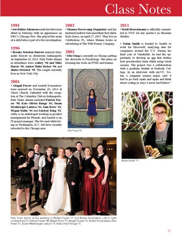• Abigail Poyser and Anatoli Kouznetsov were married on November 29, 2014 at Christ Church Cathedral with the reception at The Columbia Club in Indianapolis. Park Tudor alumni included Patrick Poyser ’98, Kate Olivier Runge ’01, Susan Meshberger Lattuca ’01, Sam Rowe ’01, Megan Kuhn ’01 and Lindsay King ’01. Abby is an audiologist working in product management for Phonak, and Anatoli is an IT project manager. The two met while living in Washington, D.C. but have recently relocated to the Chicago area.