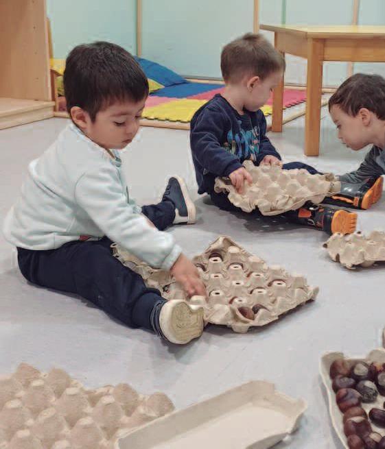 Quantitats: Comprenen "molts", "pocs", "un", "dos" Fan correspondències com posar l'activitat de posar una castanya a cada forat d'una ouera