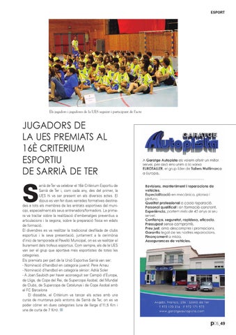 arrià de Ter va celebrar el 16è Critèrium Esportiu de Sarrià de Ter i, com cada any, des del primer, la UES hi va ser present en els diversos actes. El dijous es van fer dues xerrades formatives destinades a tots els membres de les entitats esportives del municipi, especialment als seus entrenadors/formadors. La primera va tractar sobre la realització d’embenatges preventius a articulacions i la segona, sobre la preparació física en edats de formació. El divendres es va realitzar la tradicional desfilada de clubs esportius i la seva presentació, juntament a la cerimònia d’inici de temporada al Pavelló Municipal, on es va realitzar el lliurament dels trofeus esportius. Com sempre, els de la UES van ser el grup que aportava més esportistes de totes les categories. Els premiats per part de la Unió Esportiva Sarrià van ser: - Nominació d’handbol en categoria juvenil: Pere Arnau - Nominació d’handbol en categoria sènior: Adrià Soler - A Joan Saubich per haver aconseguit ser Campió d’Europa, de Lliga, de Copa del Rei, de Supercopa Asobal, del Mundial de Clubs, de Supercopa de Catalunya i de Copa Asobal amb el FC Barcelona El dissabte, el Critèrium va tancar els actes amb una cursa de muntanya pels entorns de Sarrià de Ter, on es va poder córrer en dues categories (una de llarga d’11,5 Km i una de curta de 7 Km). ■