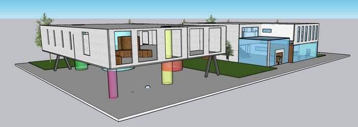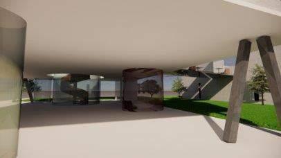 Open space underneath the children’s library building with stairs in a cylinder glass. Benches are inside some of the coloured cylinders for the elderly. Usually, the underneath space would be for client parties and special events such as festivals or art shows.