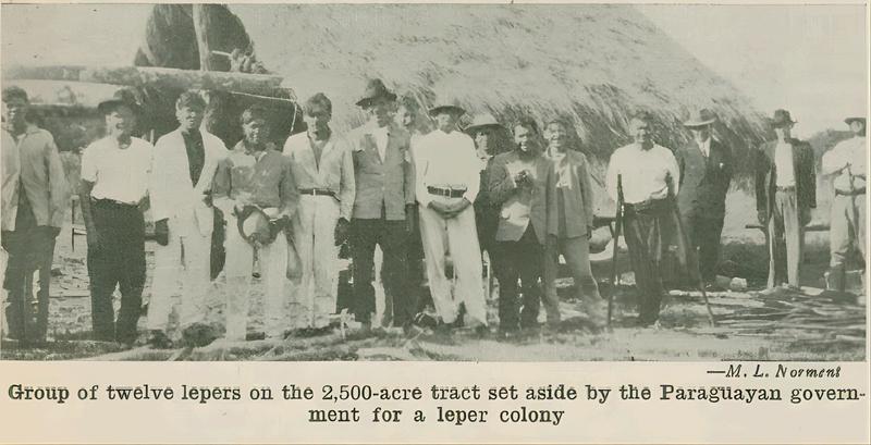 Fotografía de M. L. Norment publicada en World Call, enero de 1936, con la nota: "Grupo de doce leprosos en el terreno de 2.500 acres que el gobierno paraguayo ha designado para una colonia de leprosos". Imagen reproducida cortesía de Christian Theological Seminary y Chalice Press.