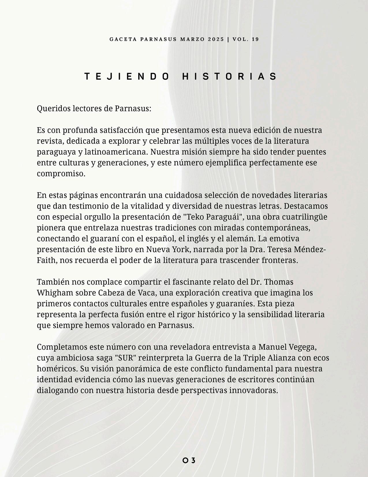 La revista literaria Parnasus presenta su nueva edición dedicada al diálogo intercultural a través de la literatura. Este número reúne la emotiva presentación de "Teko Paraguái", obra cuatrilingüe que une tradiciones guaraníes con el mundo; una fascinante entrevista con Manuel Vegega sobre su saga épica "SUR"; el hermoso poema "Bendito el amanecer" de Bob Ambrose traducido por Thomas Whigham, y un relato histórico-literario sobre Cabeza de Vaca y su encuentro con la cultura guaraní. Una edición que celebra cómo en el encuentro de voces diversas se escribe la verdadera historia de nuestra humanidad común.