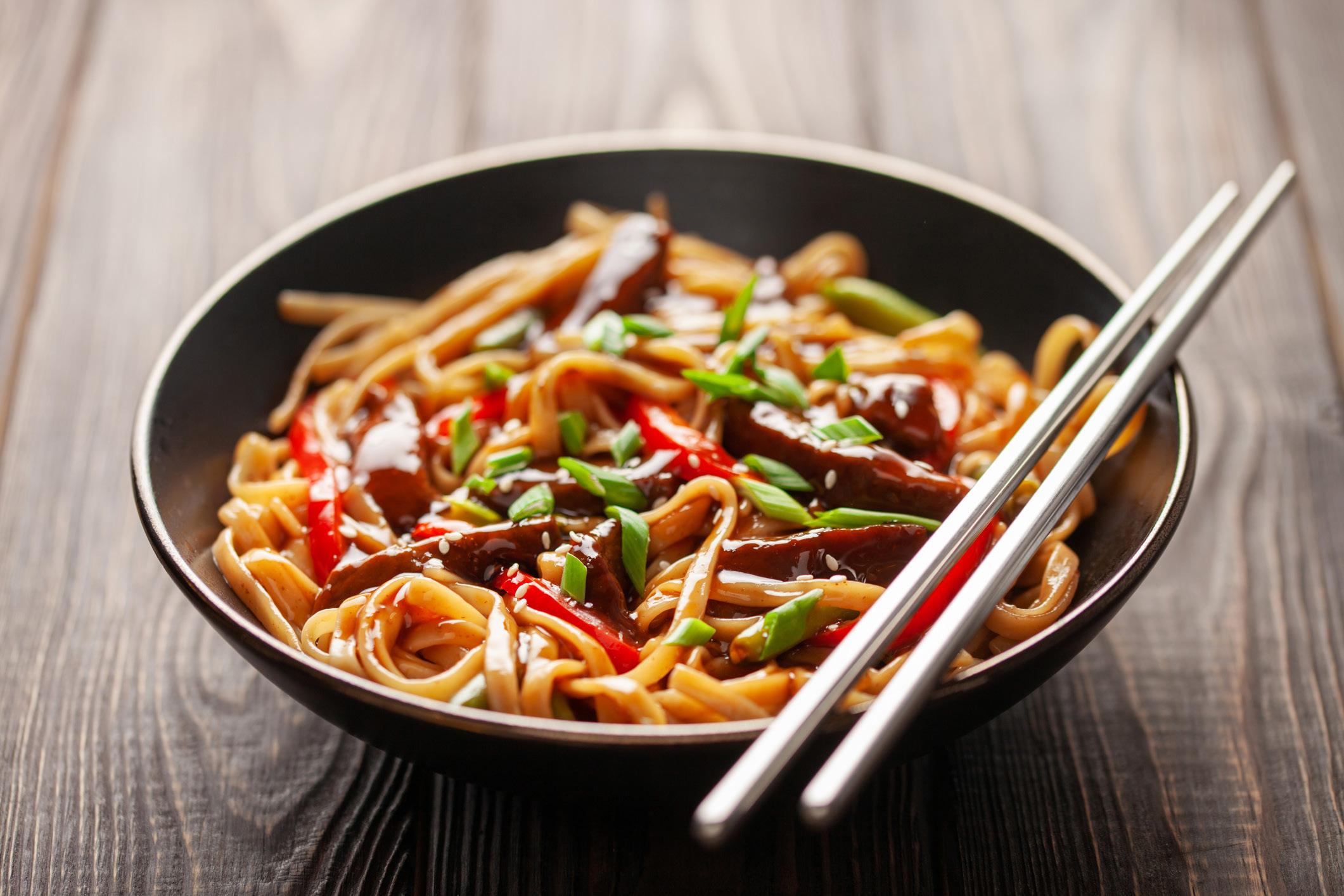Bring a pot of water to a boil and cook the noodles according to package instructions. Drain, rinse, and toss with 1 tablespoon sesame oil to prevent sticking. Set aside.