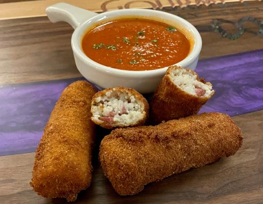 the touch add the prosciutto and mozzarella and mix with your latex covered hands. Transfer to a large pastry bag cut wide, with no tip. Pipe out 1 inch diameter by 3.5-inch-long logs, place in the fridge for an hour, or overnight. Set up a breading station of flour, beaten eggs and breadcrumbs. Coat the logs with flour and remove excess, then dip in egg and then roll in the breadcrumbs. We use Soybean oil to fry them. Working in batches carefully brown all the croquettes and transfer to paper towels to dry. Finish in the oven for ten minutes and serve with your favorite marinara or dipping sauce.