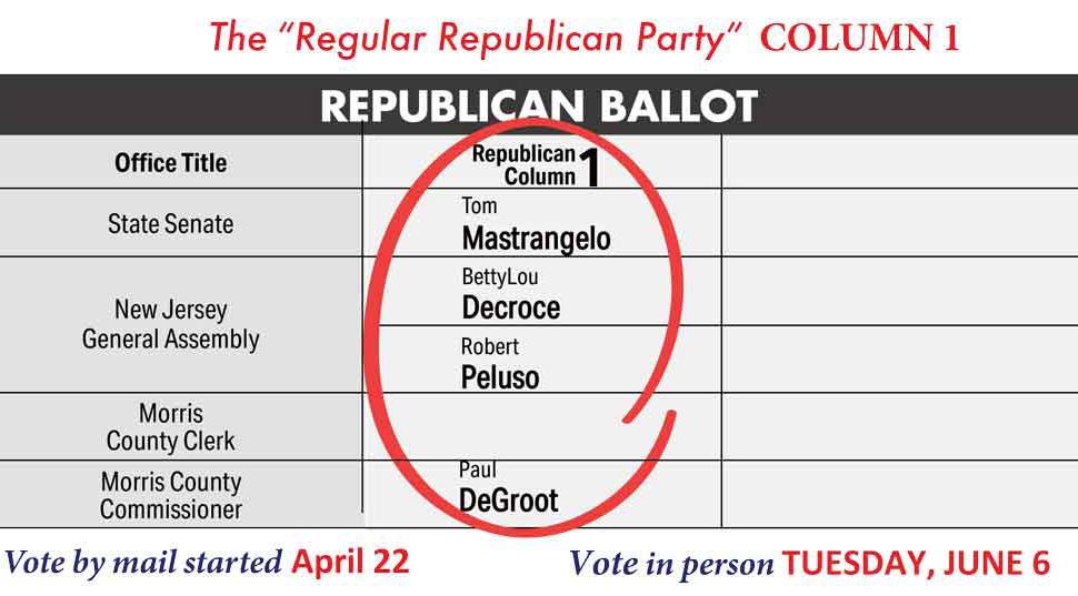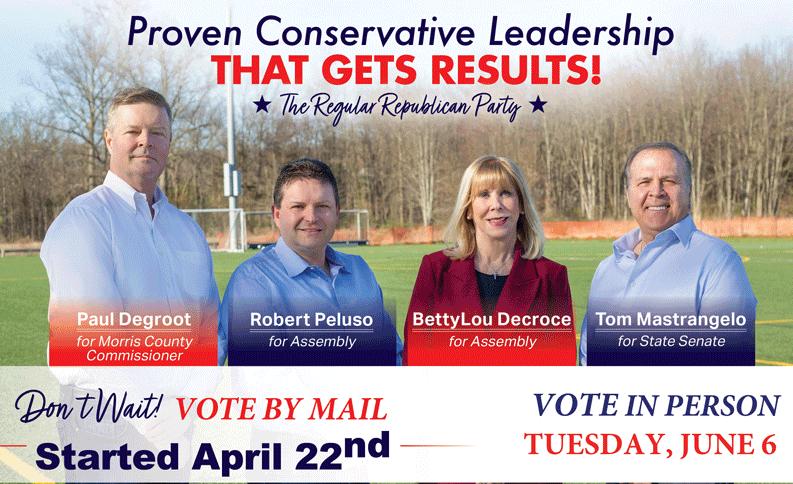 Paid for by Election Fund of BettyLou DeCroce for Assembly – Amberly Gilroy, Treasurer.; Paid for by Friends of Tom Mastrangelo for Senator; Paid for by Friends of Robert Peluso for Assembly; Paid for by DeGroot for Commissioner