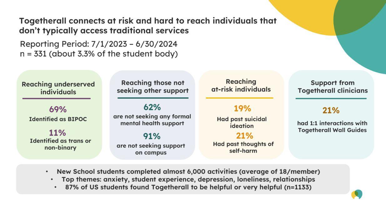 All for NarWELL has been an extremely important initiative on our New School campus. The training modules and platforms have reached many New School community members who otherwise would have not been reached. It has better prepared our community to identify signs of concern, effectively connect with, support, and refer our community members in need of support and resources. The project has also involved many of our students in reaching out to their peers across campus which we know is a great way for students to take in important information and know where to turn when needed.