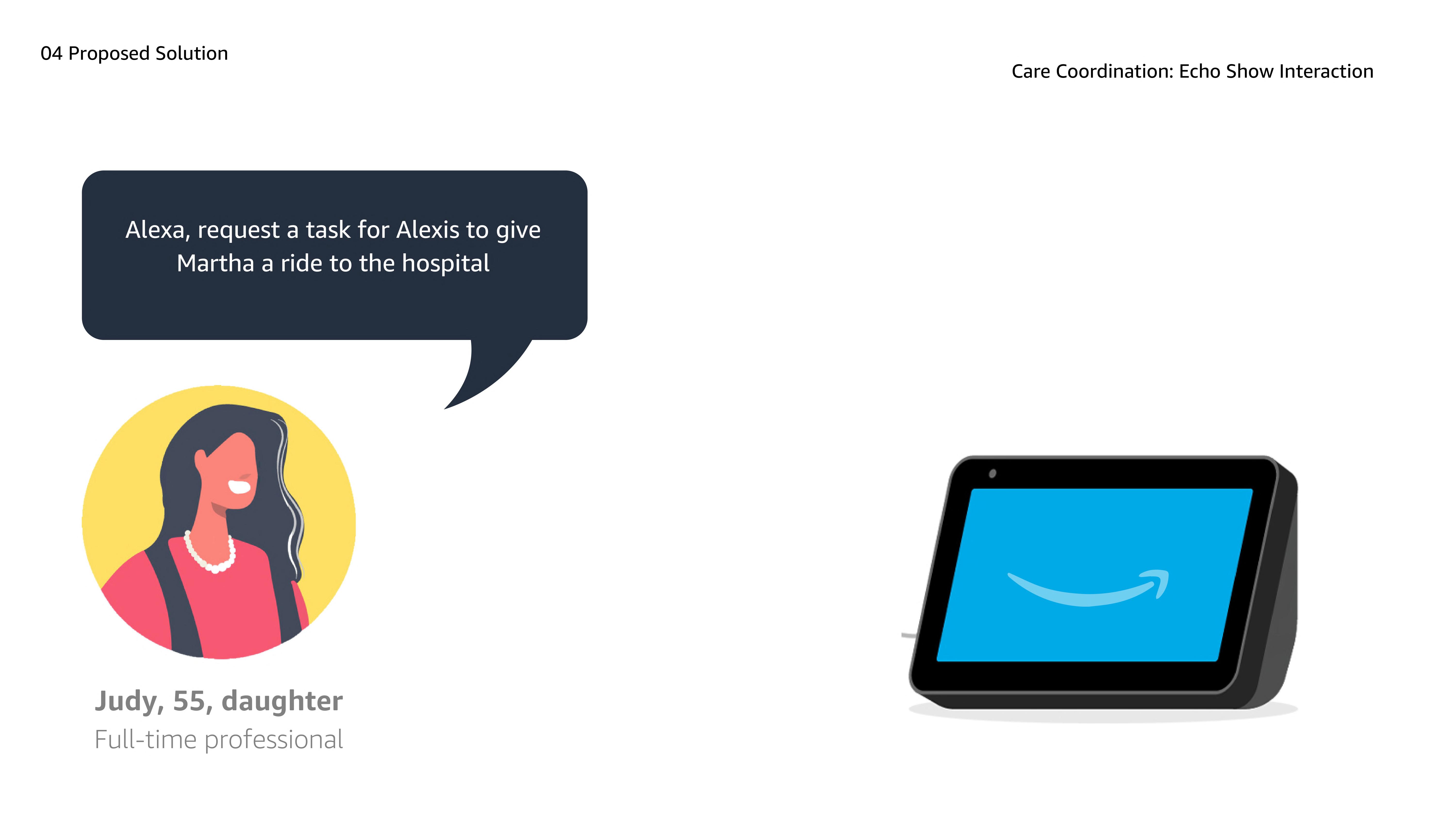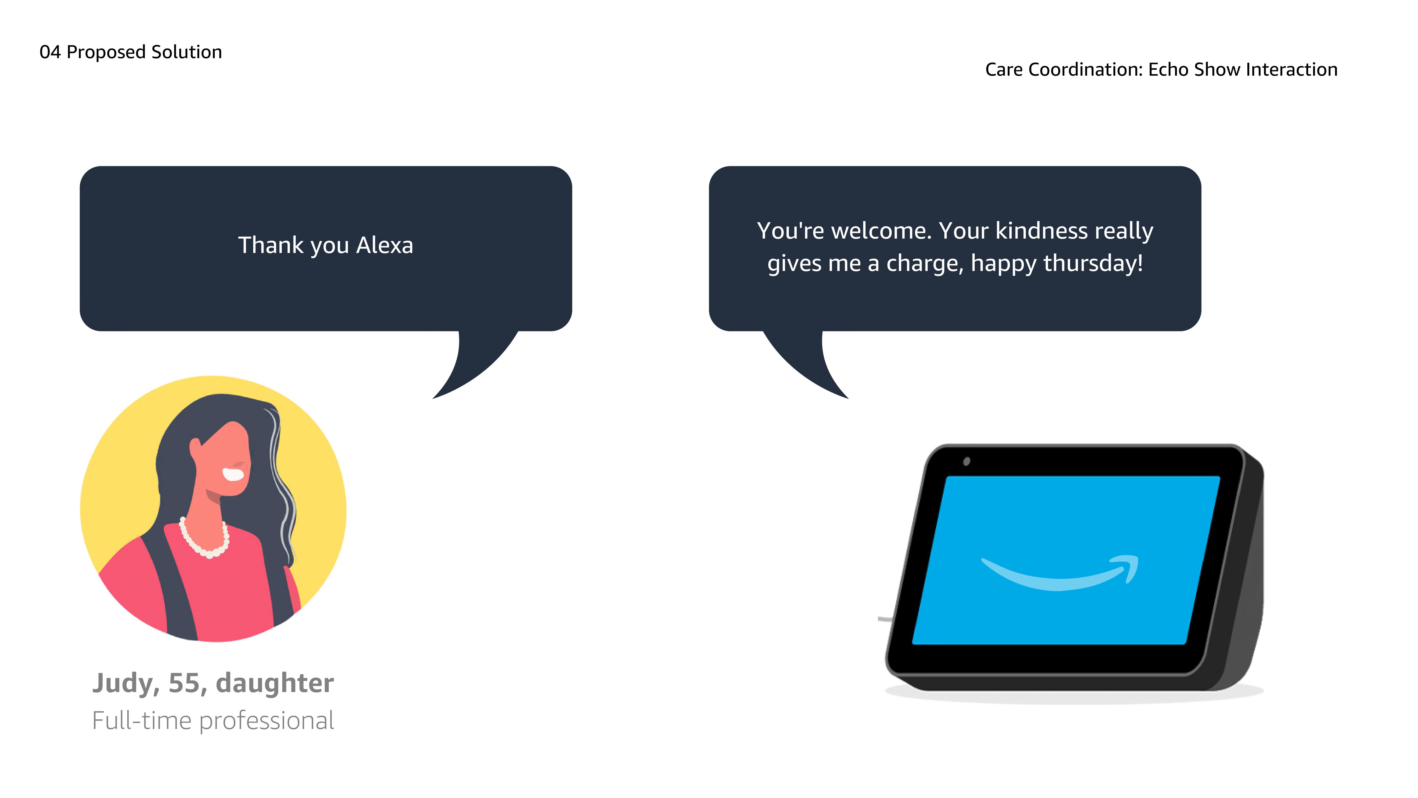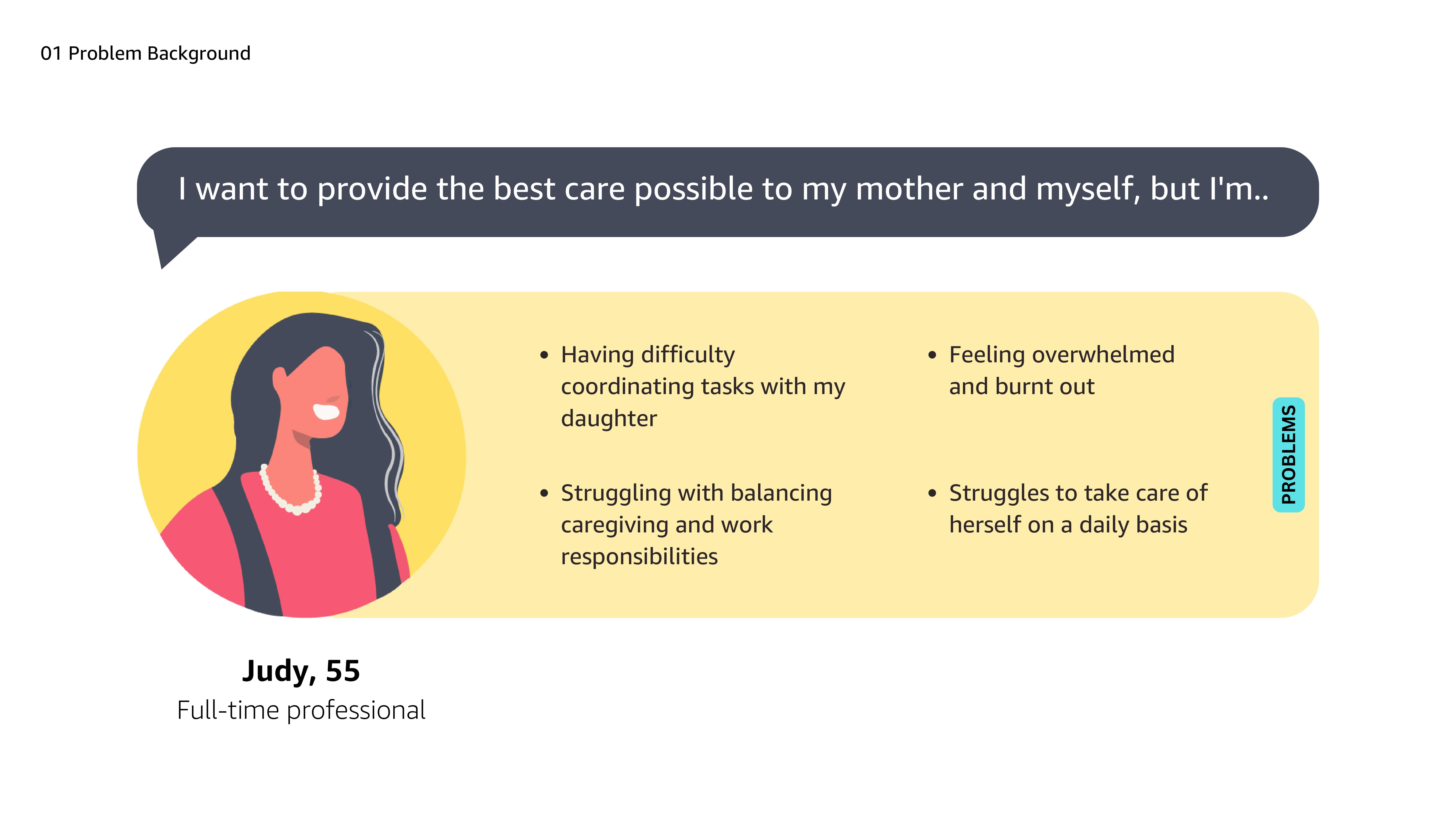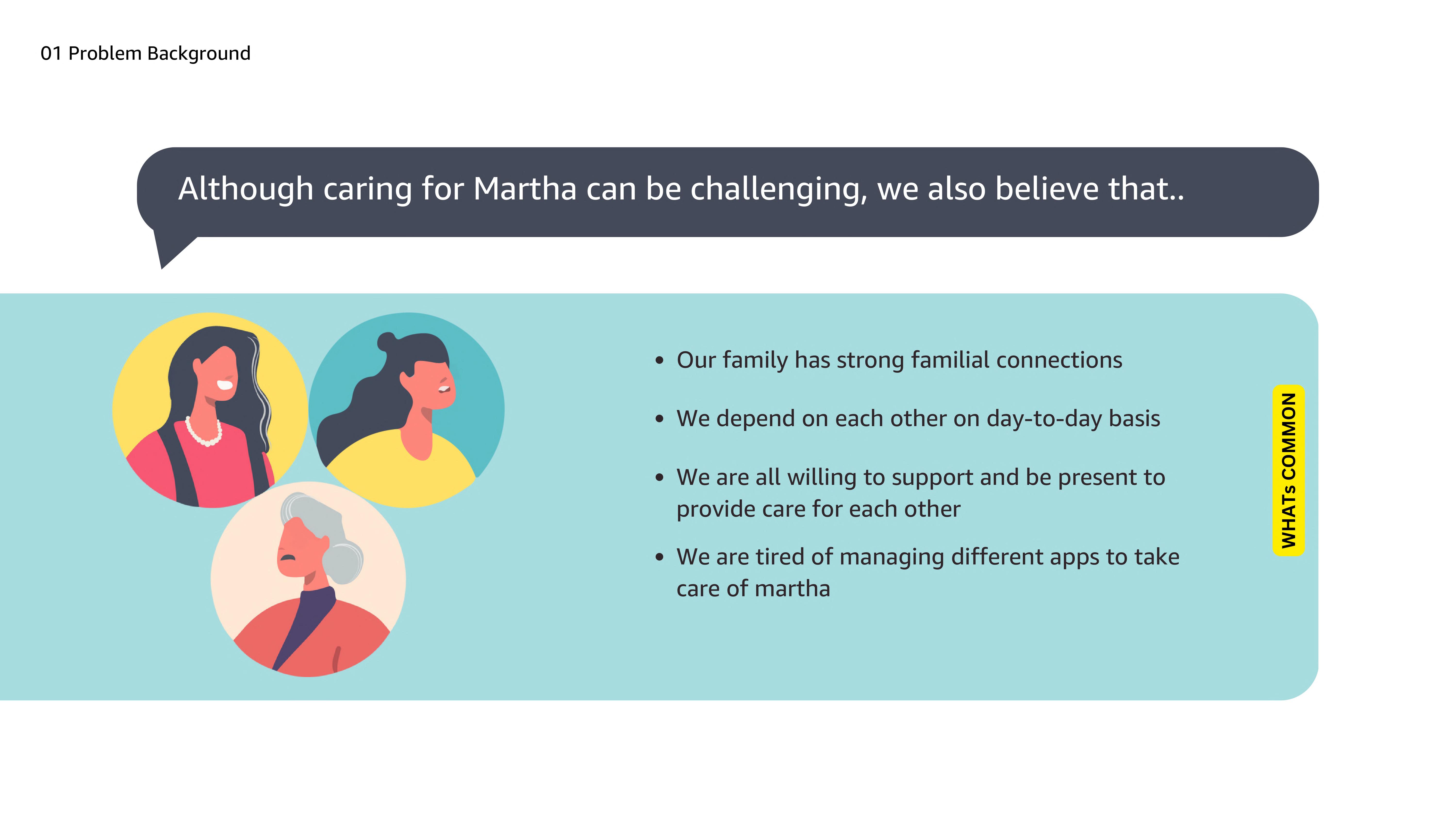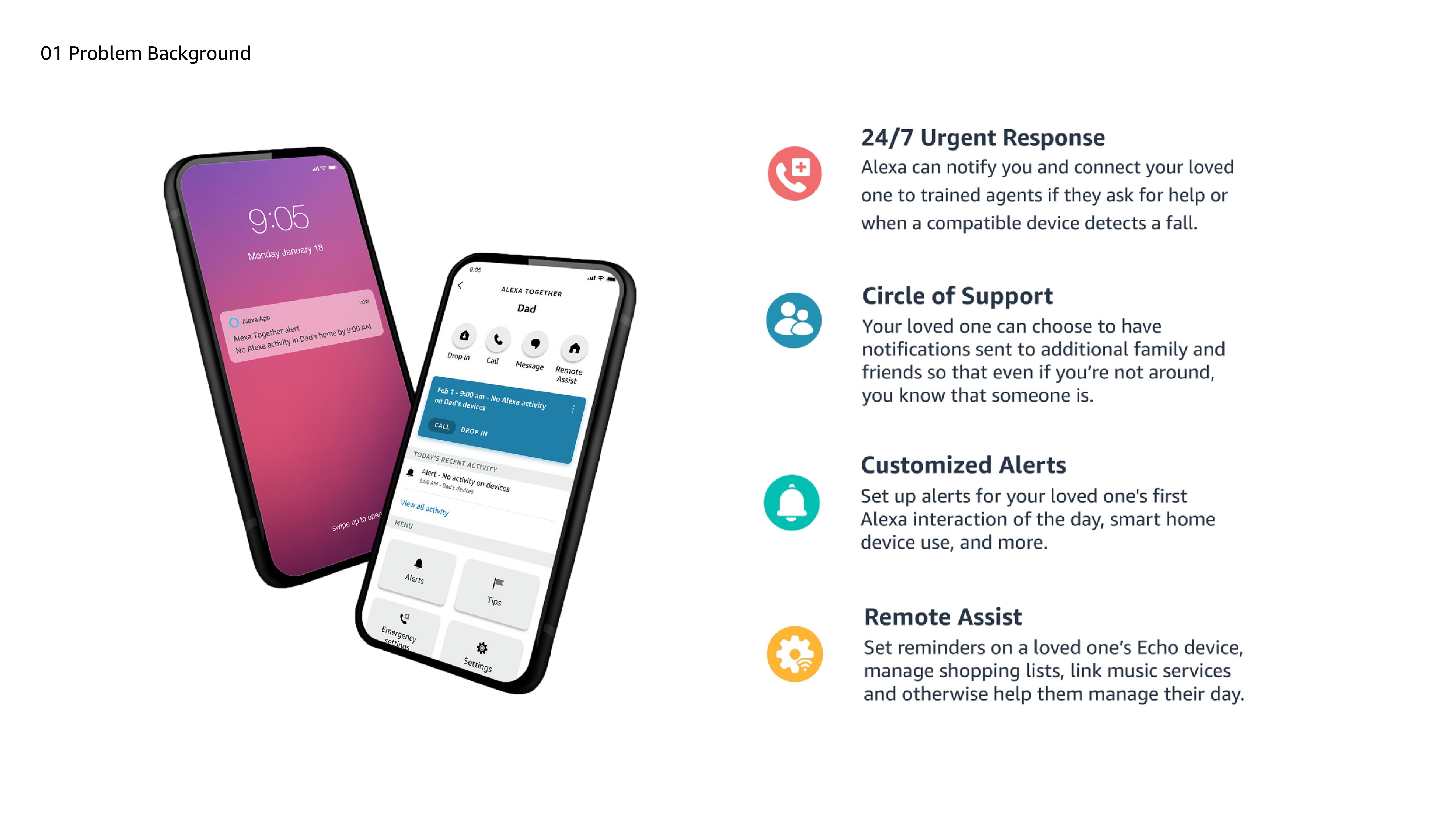 While initially targeting care recipients living alone, we identified an emerging living configuration that could benefit from collaborative caregiving. By promoting shared responsibilities, caregivers in multi-generational families can care for themselves while delivering better care to the care recipient. With 24/7 urgent response and remote assistance, Amazon empowers caregivers, revolutionizing ageing alongside technology at home.