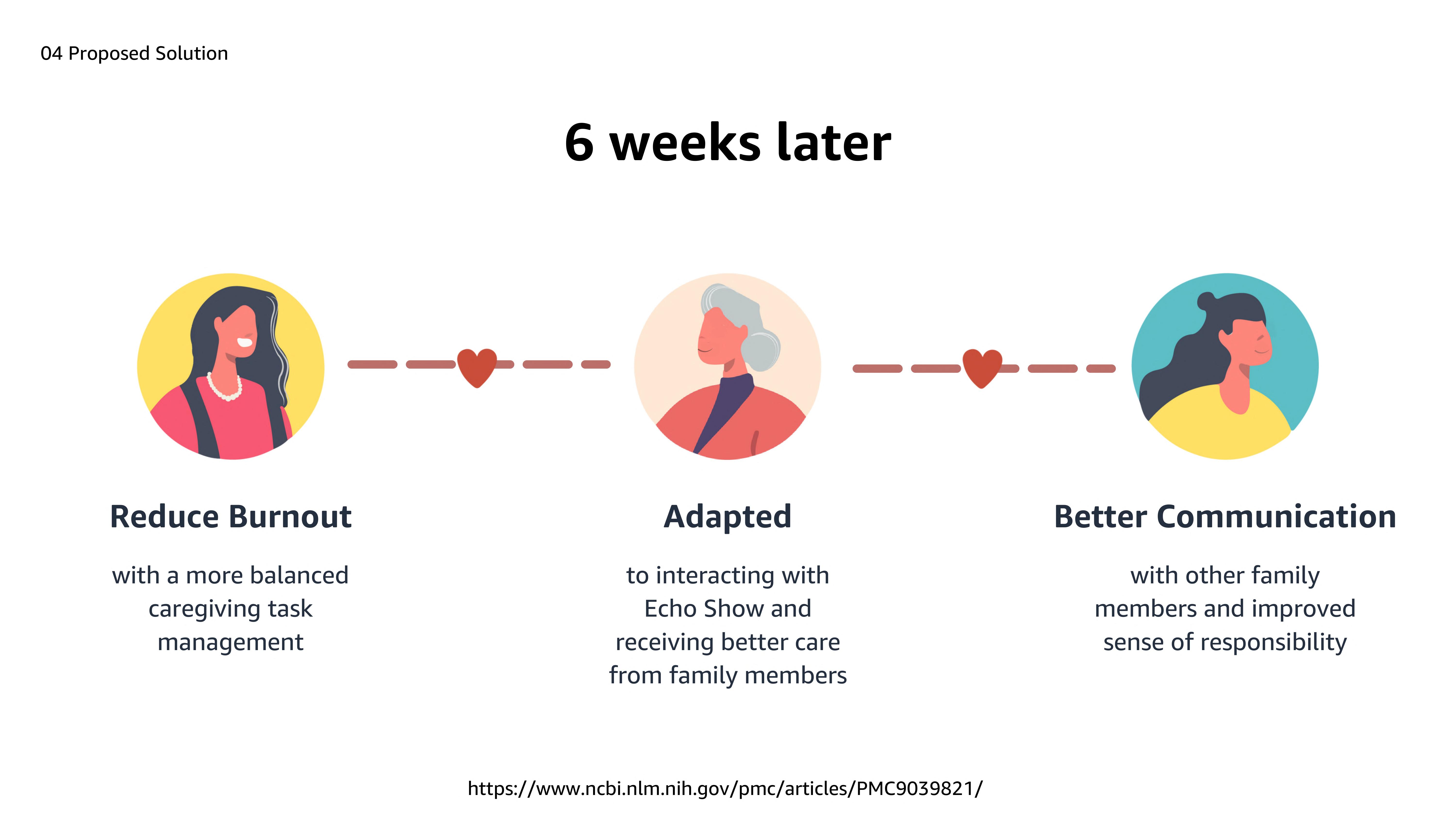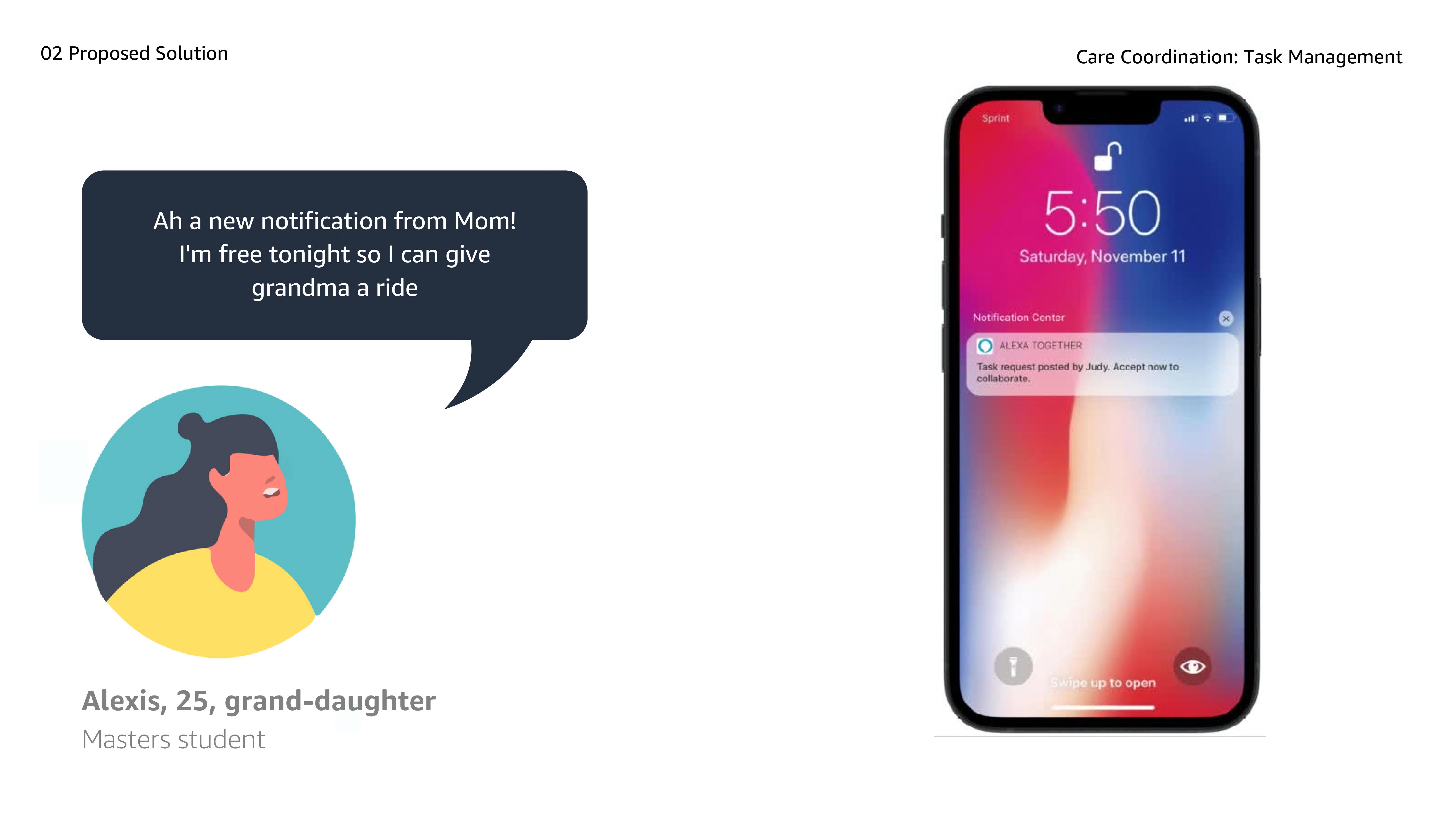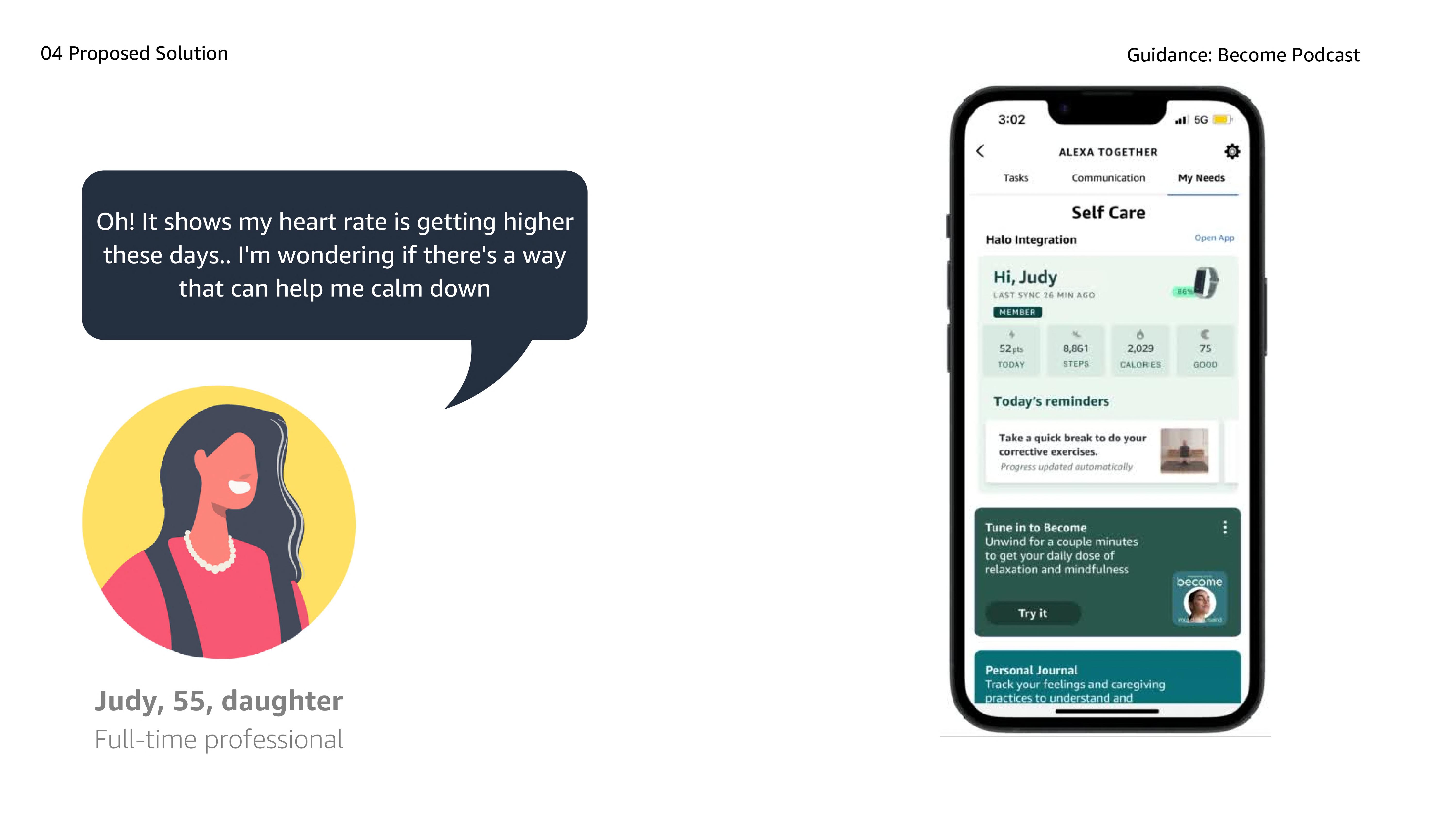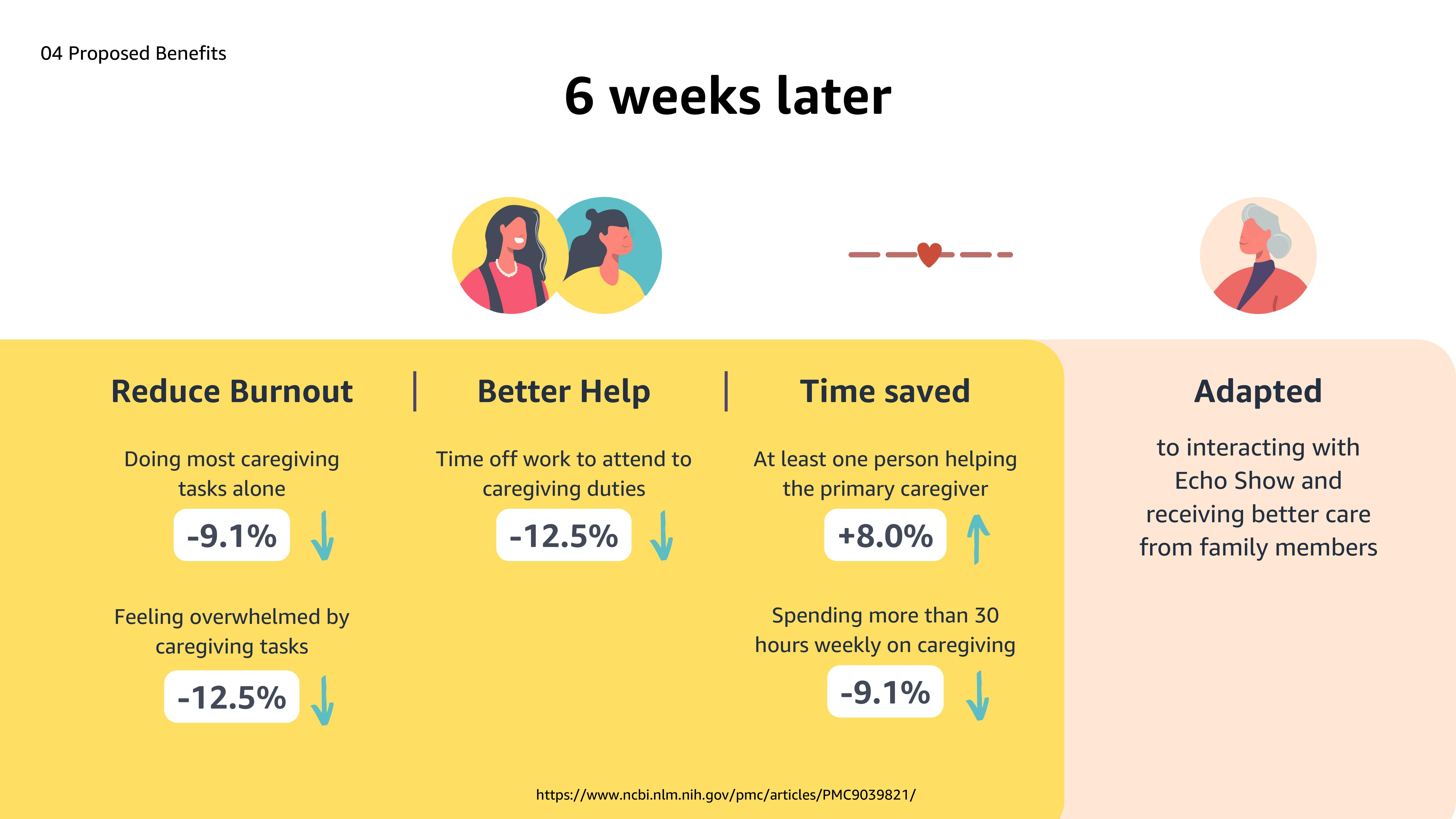 While initially targeting care recipients living alone, we identified an emerging living configuration that could benefit from collaborative caregiving. By promoting shared responsibilities, caregivers in multi-generational families can care for themselves while delivering better care to the care recipient. With 24/7 urgent response and remote assistance, Amazon empowers caregivers, revolutionizing ageing alongside technology at home.