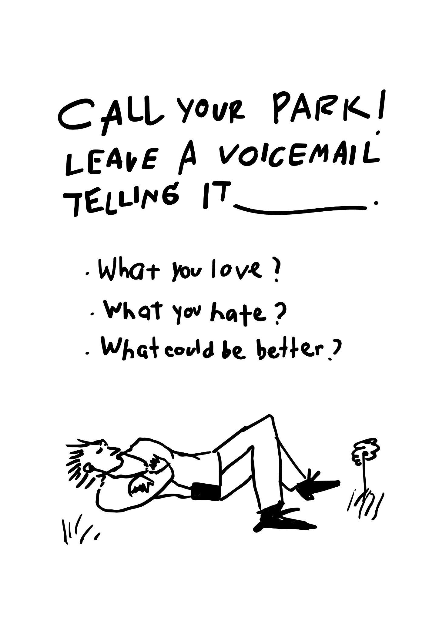 Dial-A-Park is a dialogue between NYC Parks and the people who use them. We asked New Yorkers to overcome phone phobia, dial up a park, and leave an honest voicemail telling them what they love, what they hate, and what they wish were different. The aim of this project is to start a conversation, or ideally many conversations, about individual and community needs, how public spaces are, or are not, serving them today, and what a better future for our parks could look like.