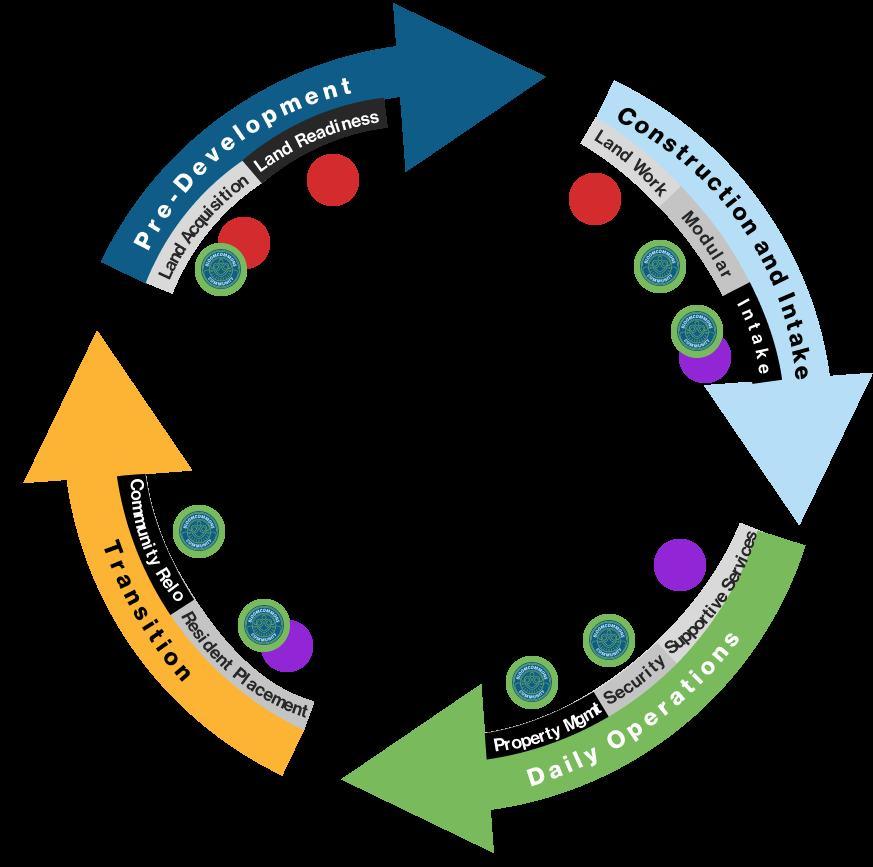 A rapidly deployable, temporary and circular housing model that helps people who are experiencing homelessness find supportive housing by eliminating communal living and qualification requirements, and providing individual housing units, support, and community.