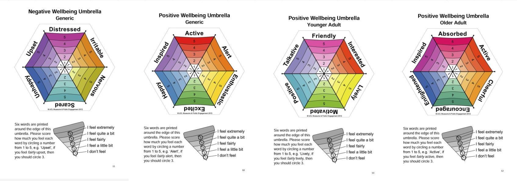 The University College London Museums Wellbeing Toolkit measures emotional change before and after cultural activities. But: emotions are complex wellbeing is social, emotional, physical, and communal measurement tools often feel too rigid or incomplete