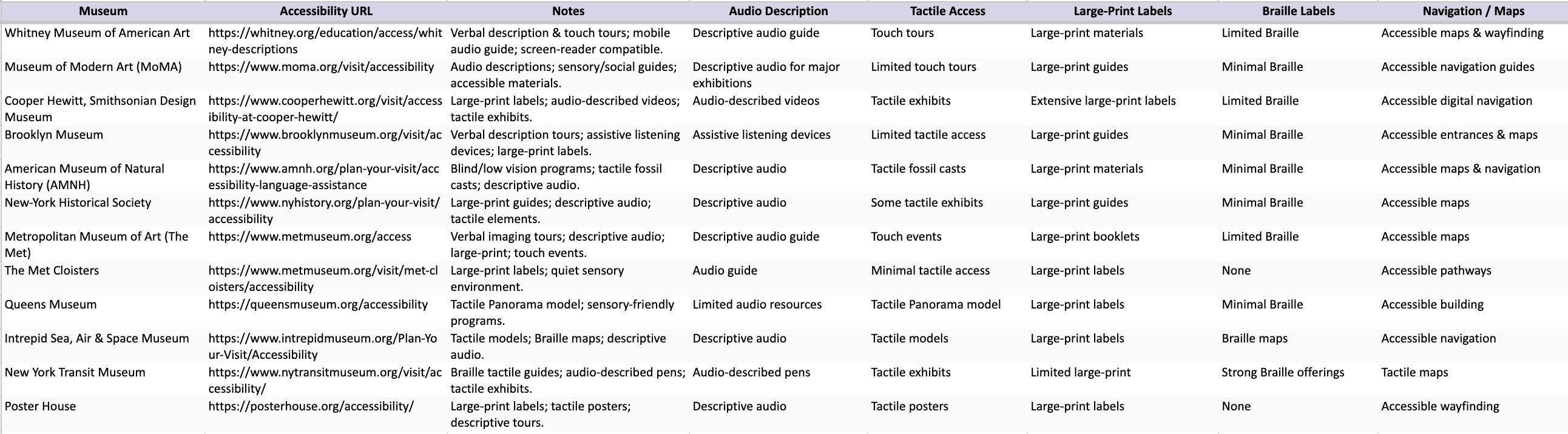 Regular verbal description tours, staff training, tactile + visual aids, screen-reader compatibility. Strong, dedicated low-vision support.