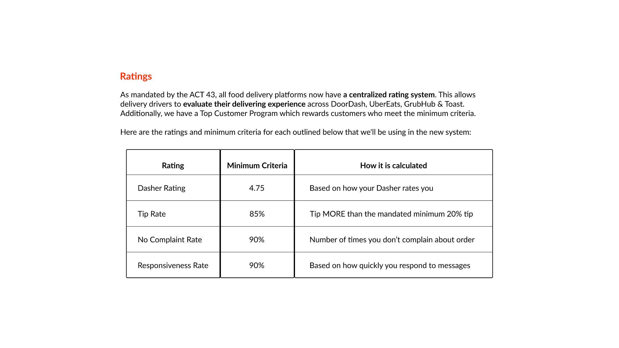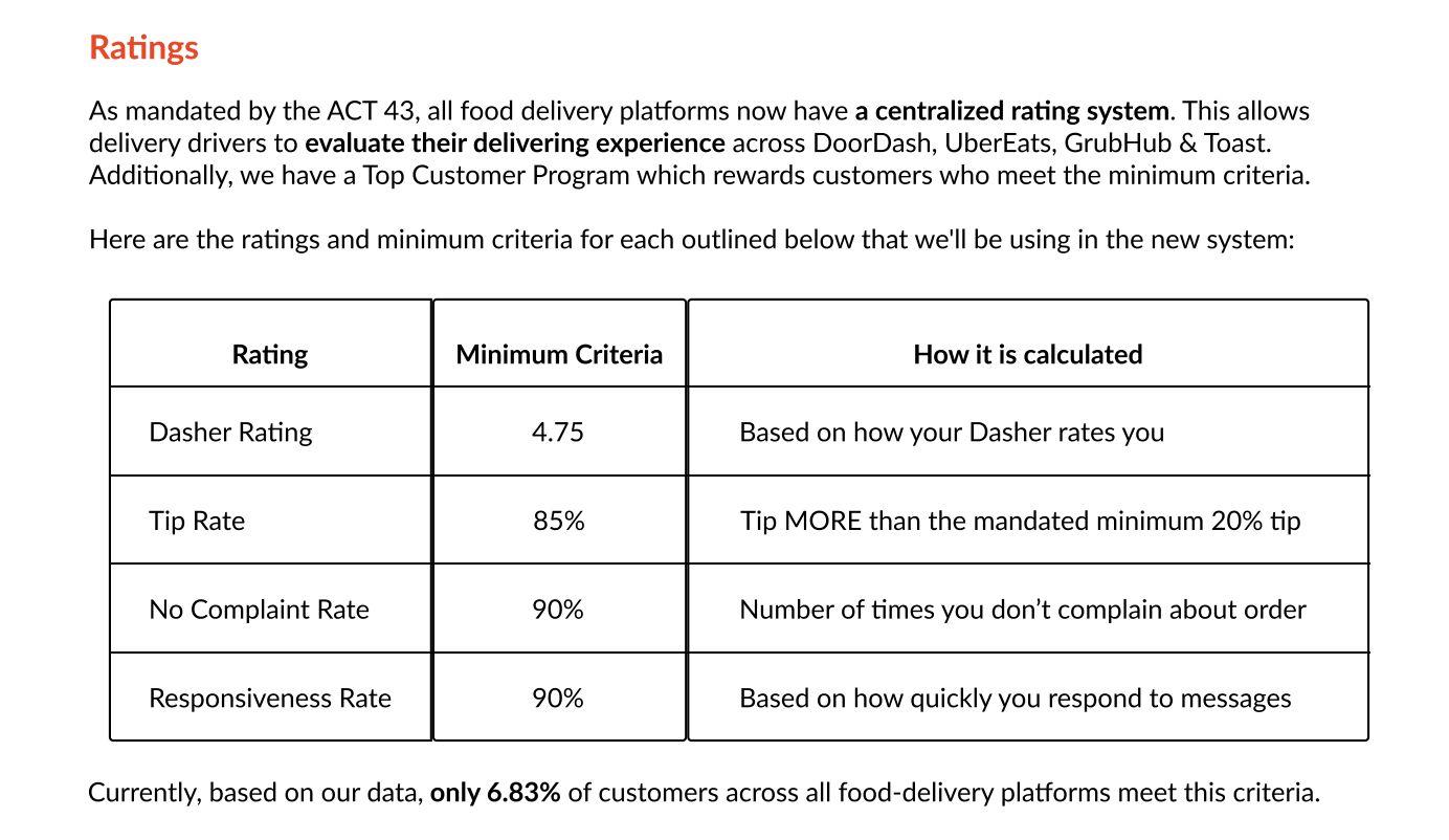 The Customers will tip more and be nicer to delivery drivers to meet minimum criteria and to have access to all restaurants.