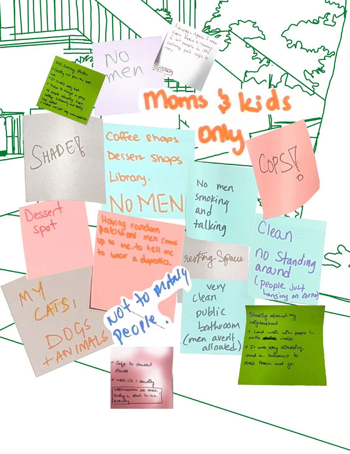 Initial fieldwork involved storytelling workshops with South Asian women, where participants articulated layered experiences of exclusion, adaptation, and resilience. Many shared how public spaces—especially parks, plazas, and transit hubs—were often sites of discomfort, harassment, and hyper-surveillance. Even within ethnic enclaves like Jackson Heights, participants faced language barriers, a lack of shaded seating, inaccessible infrastructure, and subtle forms of racial and gendered marginalization. These everyday barriers often led women to retreat from public life, relying instead on private or informal gathering spots to feel safe or culturally seen.