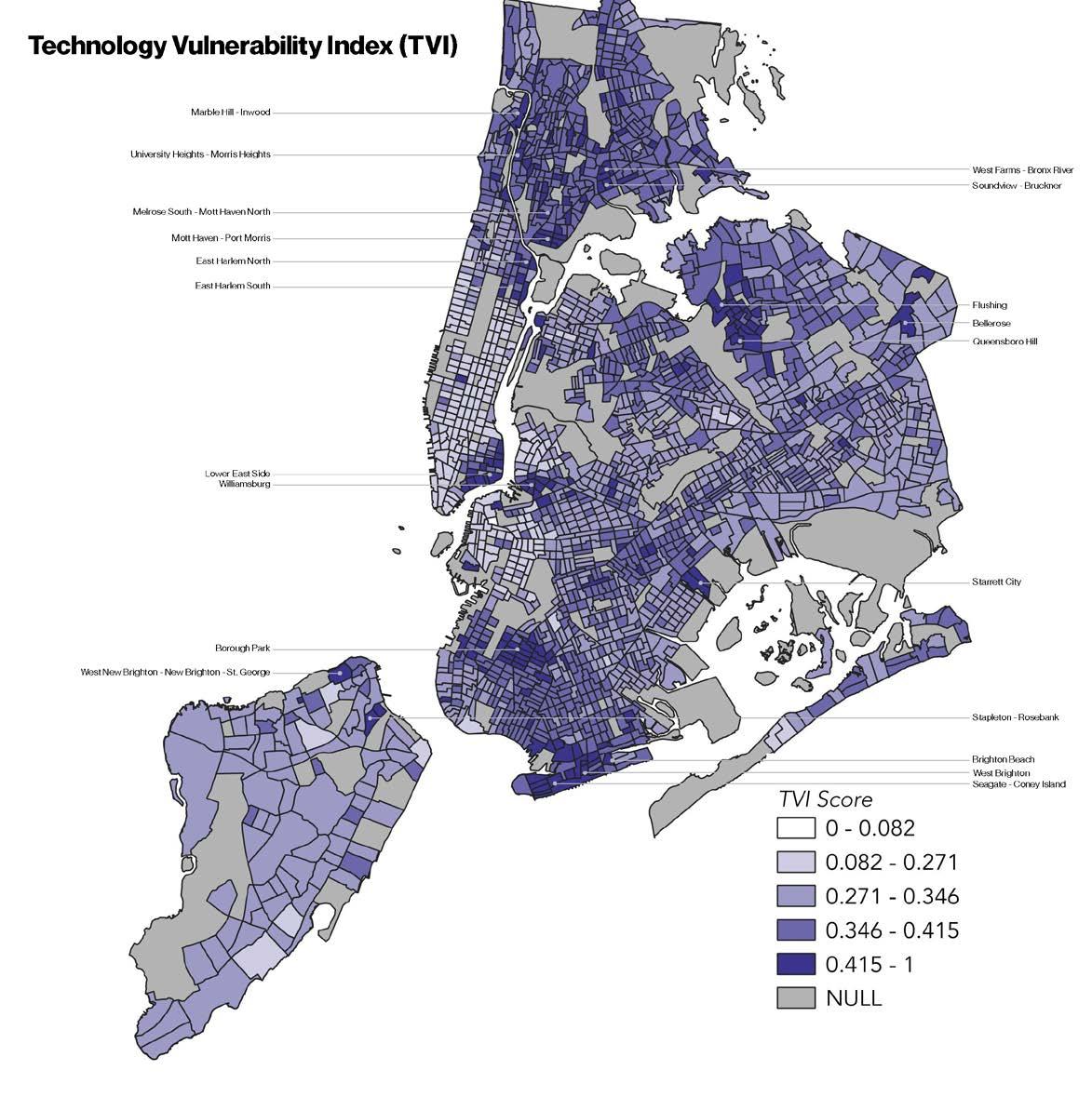 The Right to Disconnect addresses these tensions through the creation of a Digital Privacy Toolkit, a modular, accessible resource designed to help individuals and communities understand, protect, and reclaim their digital selves. Rather than assuming technology is automatically empowering, the project frames digital participation as a negotiation of power requiring critical awareness and collective action. To map the broader landscape of digital inequity, a Technology Vulnerability Index (TVI) was developed for New York City. The TVI aggregates spatial data at the census tract level, incorporating variables such as public WiFi hotspot density, households without computers or internet, language barriers, aging populations, disabilities, educational attainment, and income. It reveals how systemic barriers to digital access and autonomy disproportionately affect marginalized communities. A separate surveillance camera density map was produced, though surveillance metrics were not included in the TVI score, recognizing the varying perceptions of surveillance. The TVI served to highlight patterns of vulnerability rather than determine the choice of a community partner.