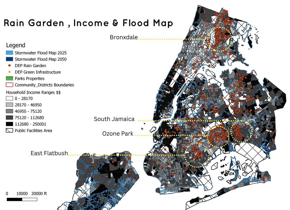 This research investigates the effectiveness of New York City’s governmental response to urban flooding, with a focus on green infrastructure initiatives as part of broader resiliency planning efforts. By utilizing a mixed-methods approach and spatial analysis of income and flood data, this study assesses both the implementation and maintenance challenges of green infrastructure across different boroughs in New York city.
