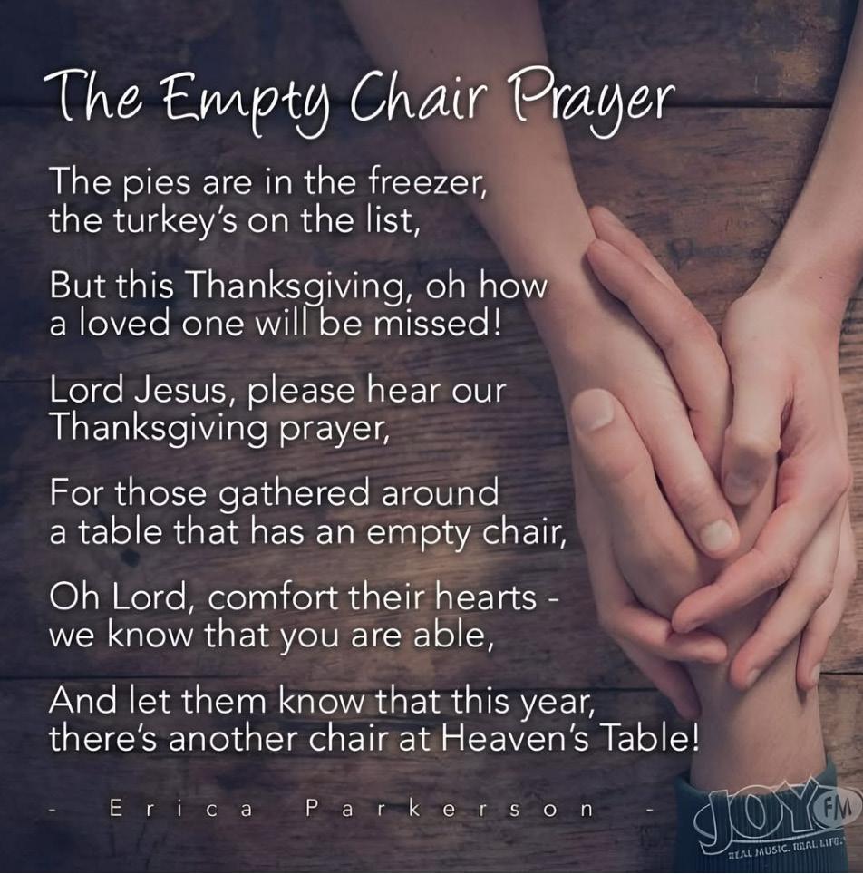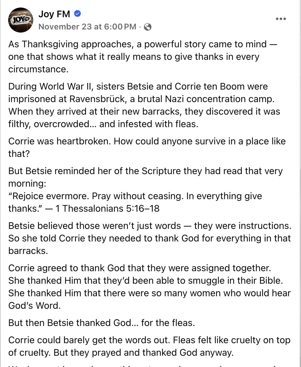 “What a nice, kind way to give thanks. This holiday season I have an unexplained ocular disease, myasthenia gravis, that has no cure and is not contagious. It stumped my ophthalmologist but upon further testing I am thankful that God chose this time in my life to experience this disease. With His help and guidance of the Holy Spirit this will be a wonderful journey. I call this mg, but My God is bigger and all will be well. Oh how I thank God for Joy FM. Maybe this Thanksgiving you too will see something wonderful in the midst of challenging circumstances. Joy to the world! Great things He has done.”