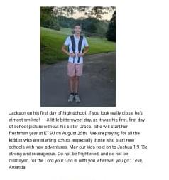I wanted to take a moment to think about Jackson during this big transition in his life. I’m sure you’ve seen similar changes with Grace! He’s definitely in my thoughts and prayers. I hope he really enjoys his freshman year, has amazing teachers, a fantastic schedule, and dives into some fun activities, whether that’s a club, sports, drama, or music! Take care! ~Gina