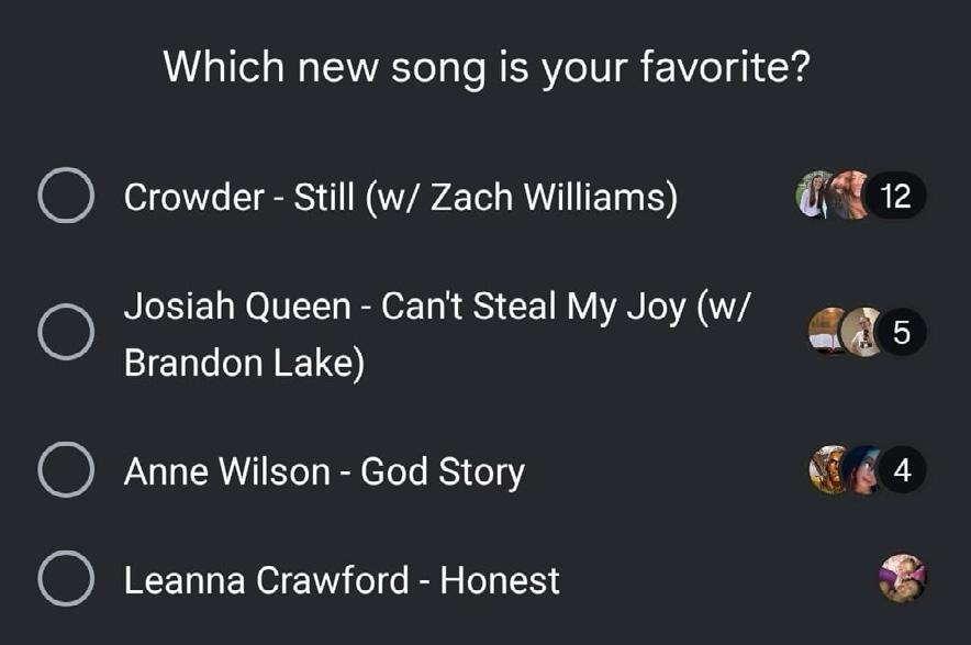 We took a poll in our Broadcast Channels on Facebook (above) and Instagram (right) to see which of the new songs was their favorite. It’s fun to see the difference between the two groups! Join our broadcast channels to stay connected.