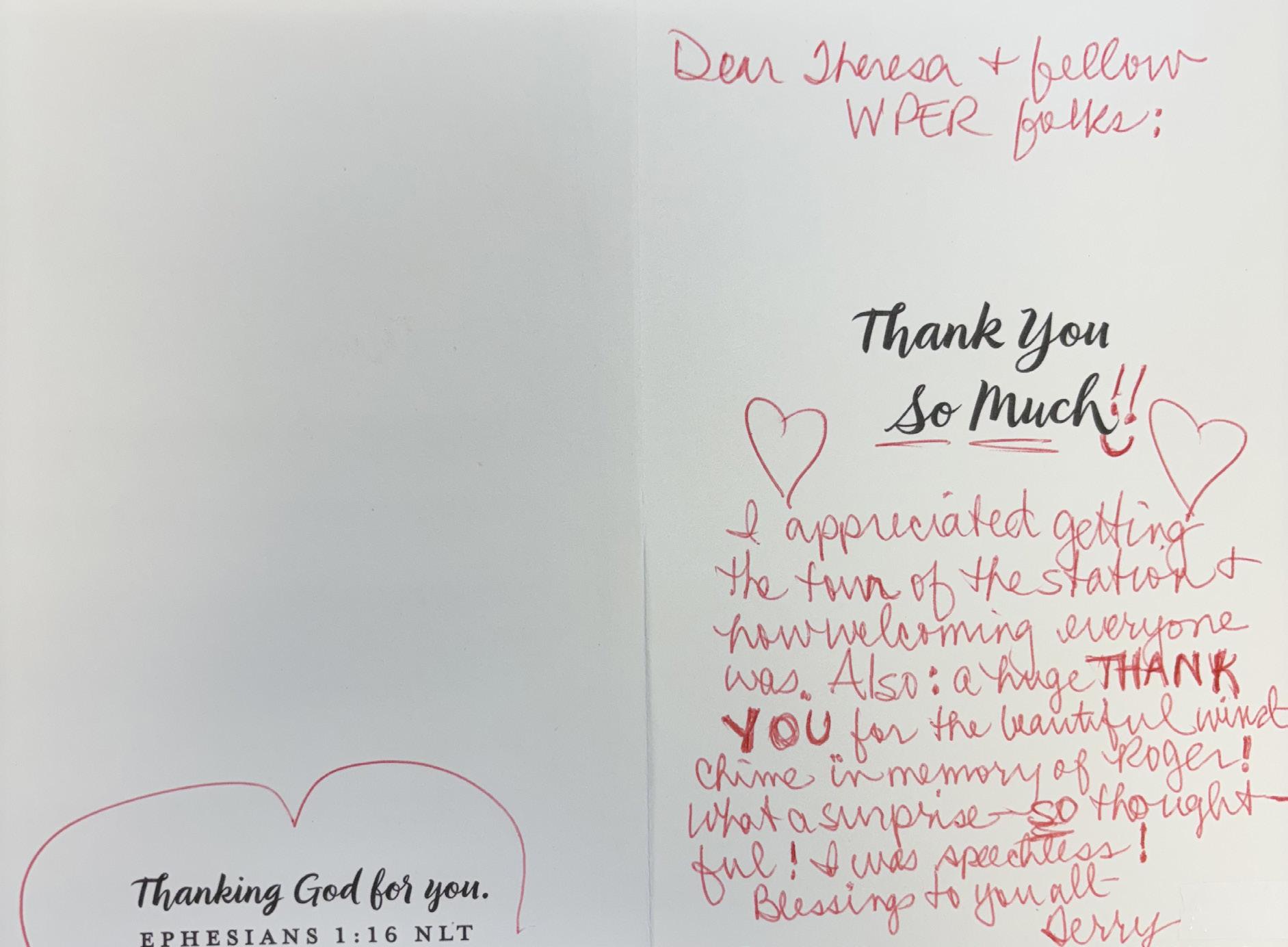 I want to say thank you to WPER ! I listen everyday to help my heart and mind stay in Jesus. I really love ‘Unsung Hero’. It makes me cry every time, just remembering my Mother. My newest favorite is Mercy Me’s ‘Oh Death’. I could listen to Mercy Me all day. Thank you all again. Also, thank you Eric! You called me after the fundraiser to check in with me. The fact that you guys actually care is amazing!”