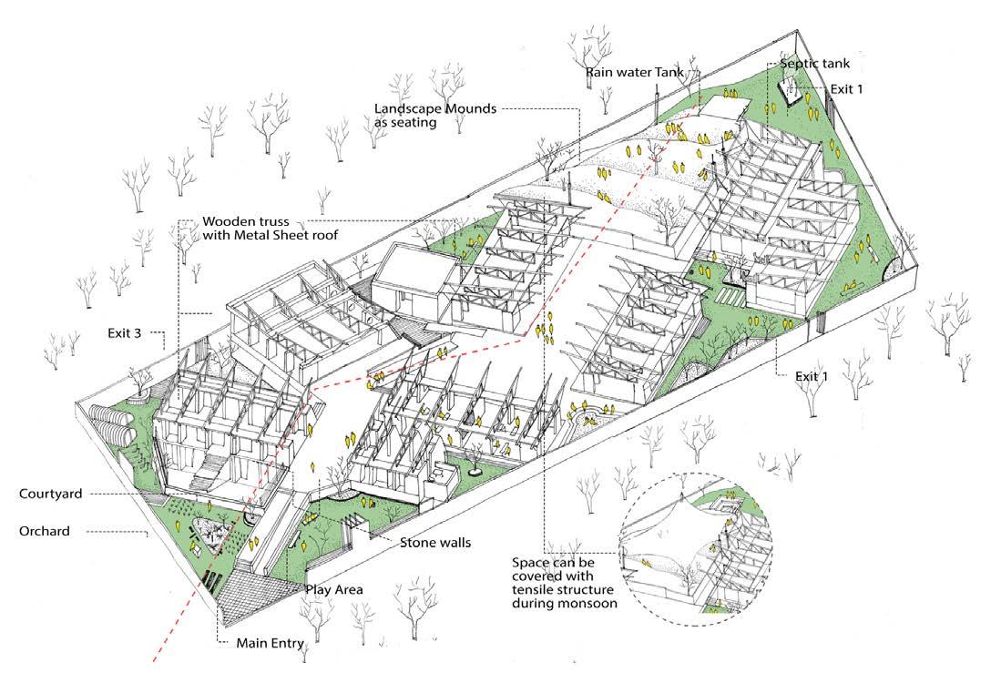 The gradual unfolding of spaces due to shifting of the Axis. The spaces have an ample amount of natural light and ventilation. The materials obtained from the local area reduce the carbon footprint of the overall built-up. Anthropometrics are kept based on children’s activities.