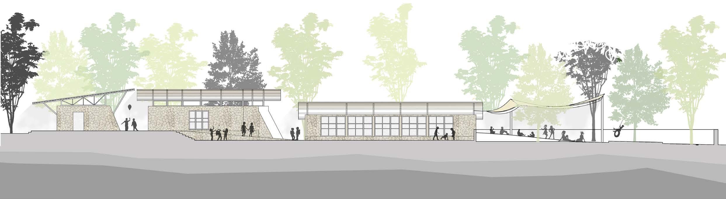 A Place for the teachers and the admin staff to sit and relax in a more informal way. The space is nicely situated between the admin office and the auditorium. The overhead keeps the space cool and shaded. The intervention of steps provide a space for them to sit and have food.