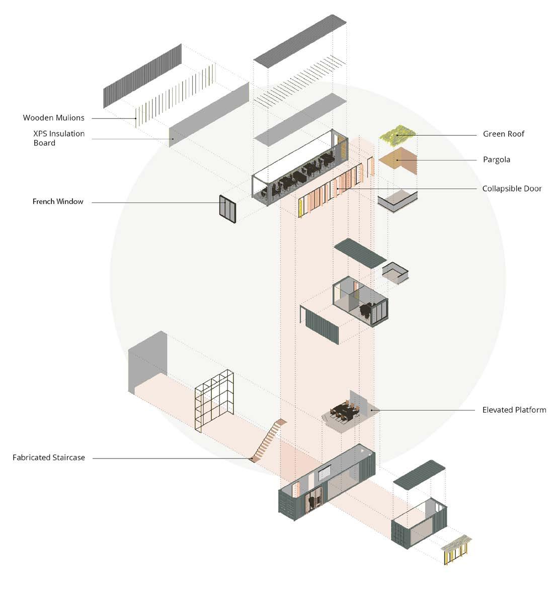 The design aims to facilitate the ease of arrangement of workspace. The surrounding and interior spaces are kept as flexible as possible mainly to adapt to varying needs of various sites.