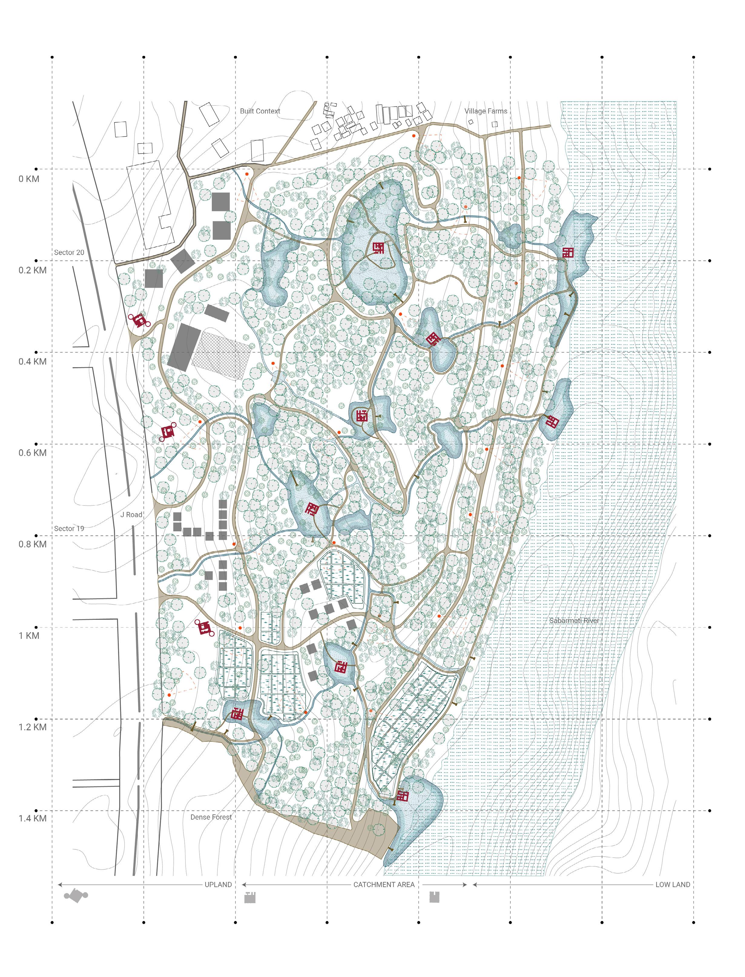 Site plan shows the juxtaposition of various layers – trails, micro catchments, and architectural interventions