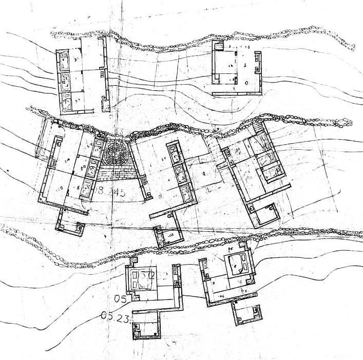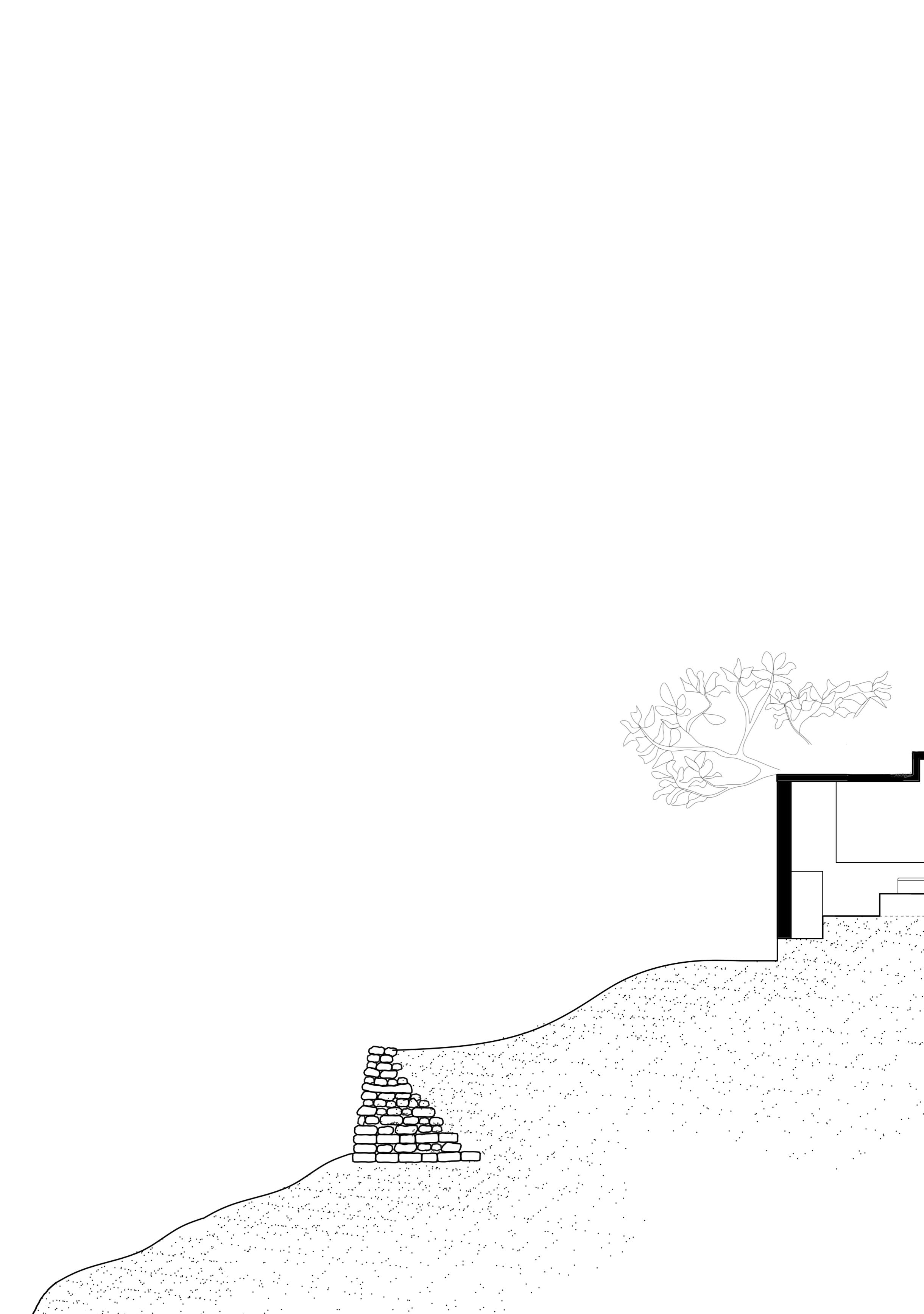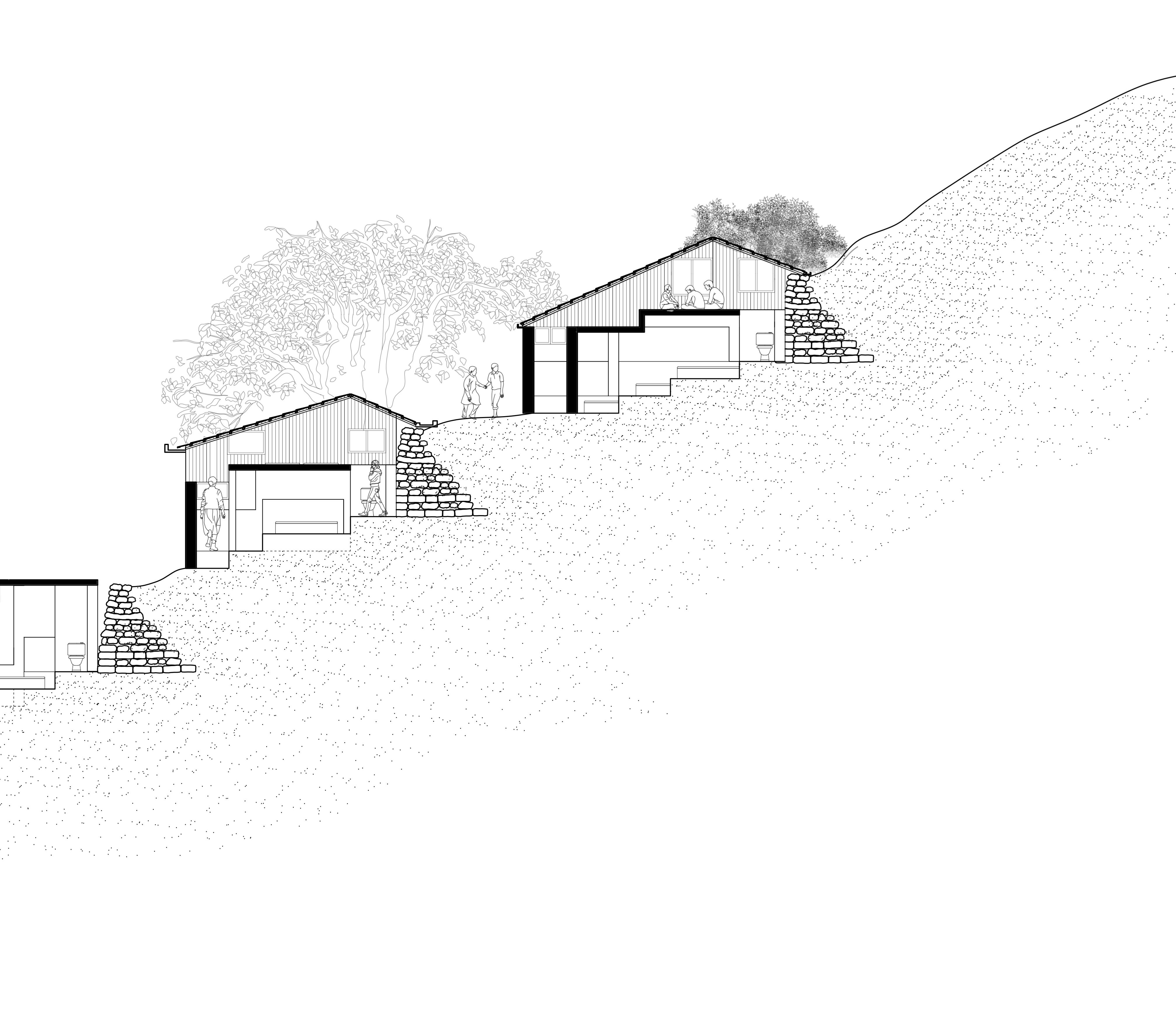 The edge of the retaining wall on the site is used as an elemnt while designing the homesteads. All of the units are placed along this edge creating shared spaces between these units.