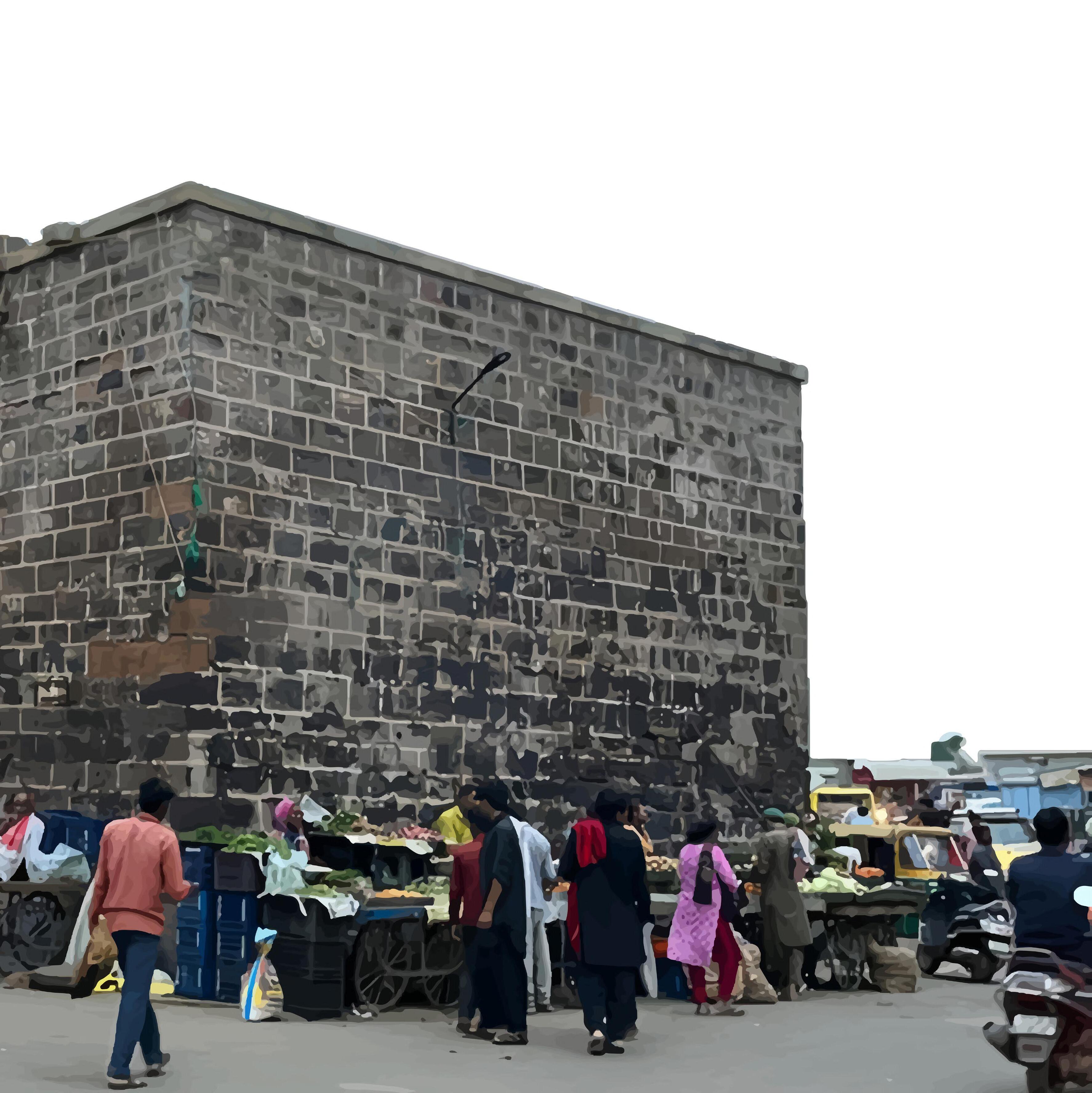 The streets around the gate are known for informal vending of a variety of goods such as fruits, vegetables, used clothes, recycled furniture and much more.