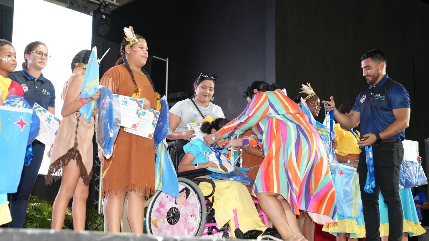 Durante e anochi aki tabata tin un momento special caminda Minister di Cultura Maduro y Minister di Deporte Croes den nomber di Gobierno a entrega Jhon Freddy Montoya di Departamento di Cultura un reconocimiento pa comparti su talento y asisti y guia durante nso scolnan pa participa den e competencia di Baile Escolar den e Weganan Escolar. Ademas e mandatario ta felicita y ta gradici su colega Minister di Enseñansa y Deporte Endy Croes, tur departamentonan di Gobierno, IBISA, Departamento di Cultura, Comision encarga cu e organisacion di Weganan Escolar 2024 y boluntarionan cu a yuda pa por a haci e competencia di Baile Deportivo y Cultural Escolar e aña aki otro exito grandi. Masha pabien na e ganadonan y danki na tur scol y alumnonan cu a participa, masha danki ap biba nos cultura.