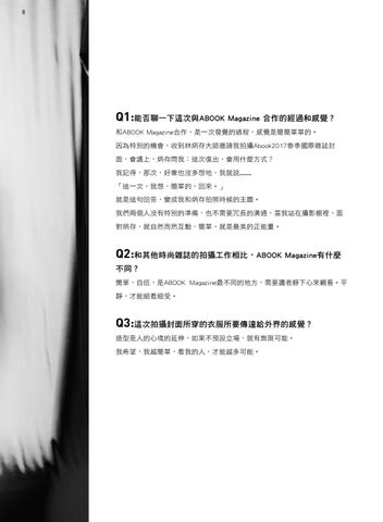Q1:能否聊一下這次與ABOOK Magazine 合作的經過和感覺? 和ABOOK Magazine合作,是一次發覺的過程,感覺是簡簡單單的。 因為特別的機會,收到林炳存大師邀請我拍攝Abook2017春季國際雜誌封 面,會議上,炳存問我:這次復出,會用什麼方式? 我記得,那次,好像也沒多想地,我就說........ 「這一次,我想,簡單的,回來。」 就是這句回答,變成我和炳存拍照時候的主題。 我們兩個人沒有特別的準備,也不需要冗長的溝通,當我站在攝影棚裡,面 對炳存,就自然而然互動,簡單,就是最美的正能量。